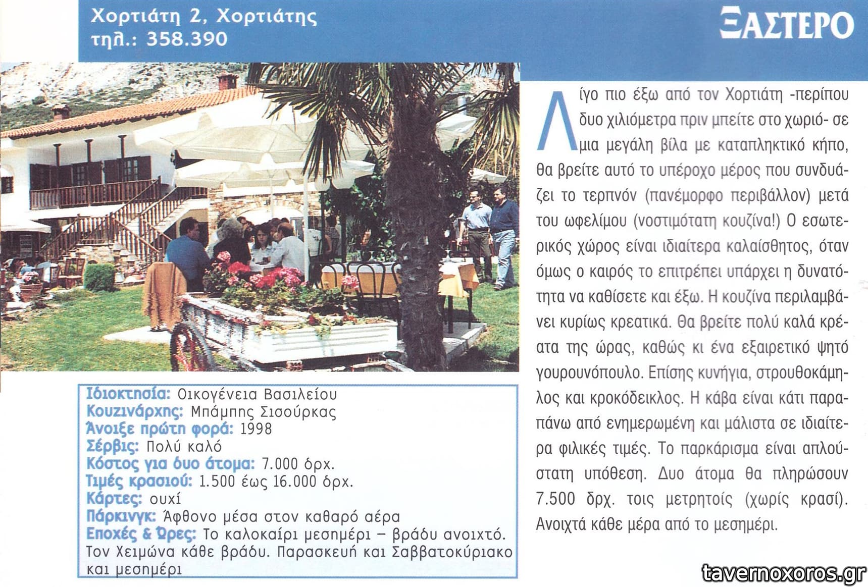 κι εγώ το χω επισκευτεί μόνο σε γάμο καλοκαίρι. το πακέτο που είχε κλείσει το ζευγάρι είχε πάρα πολλά ορεκτικά και σαλάτες, τα οποία αν και δεν παρουσίαζαν τπτ το ιδιαίτερο, ήταν αξιοπρεπέστατα τόσο για ταβέρνα και ακόμα περισσότερο για τέτοιου είδους εκδήλωση(όπου στα περισσότερα μαγαζιά φέρνουν χλαπάτσες). λερωμένα πιάτα δεν είδα, το κυρίως δεν πρόλαβα να το δοκιμάσω γιατί έγινε χαλασμός, τρελή καταιγίδα και τρεχαμε πανικόβλητοι στο κιόσκι που έχει!!!