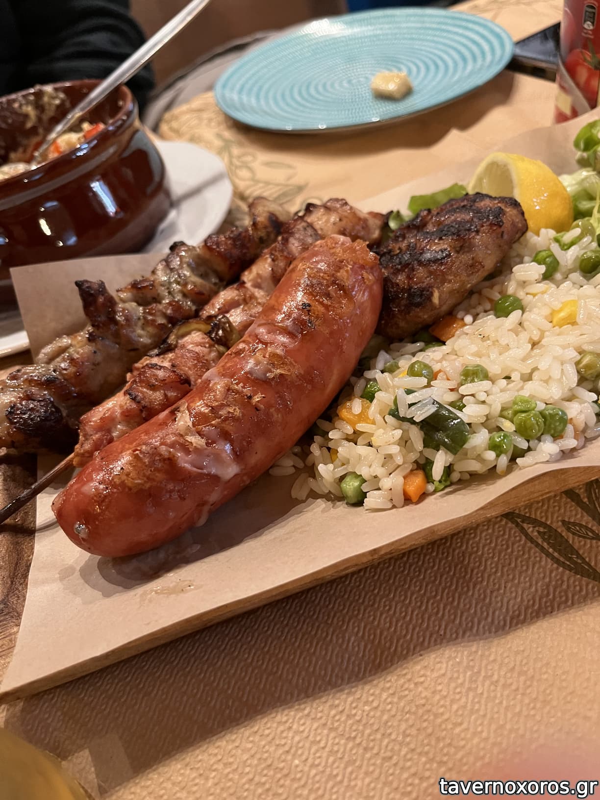 Σουβλάκι και λουκάνικο γεμιστό μια χαρά , μπιφτέκι αδιάφορο.