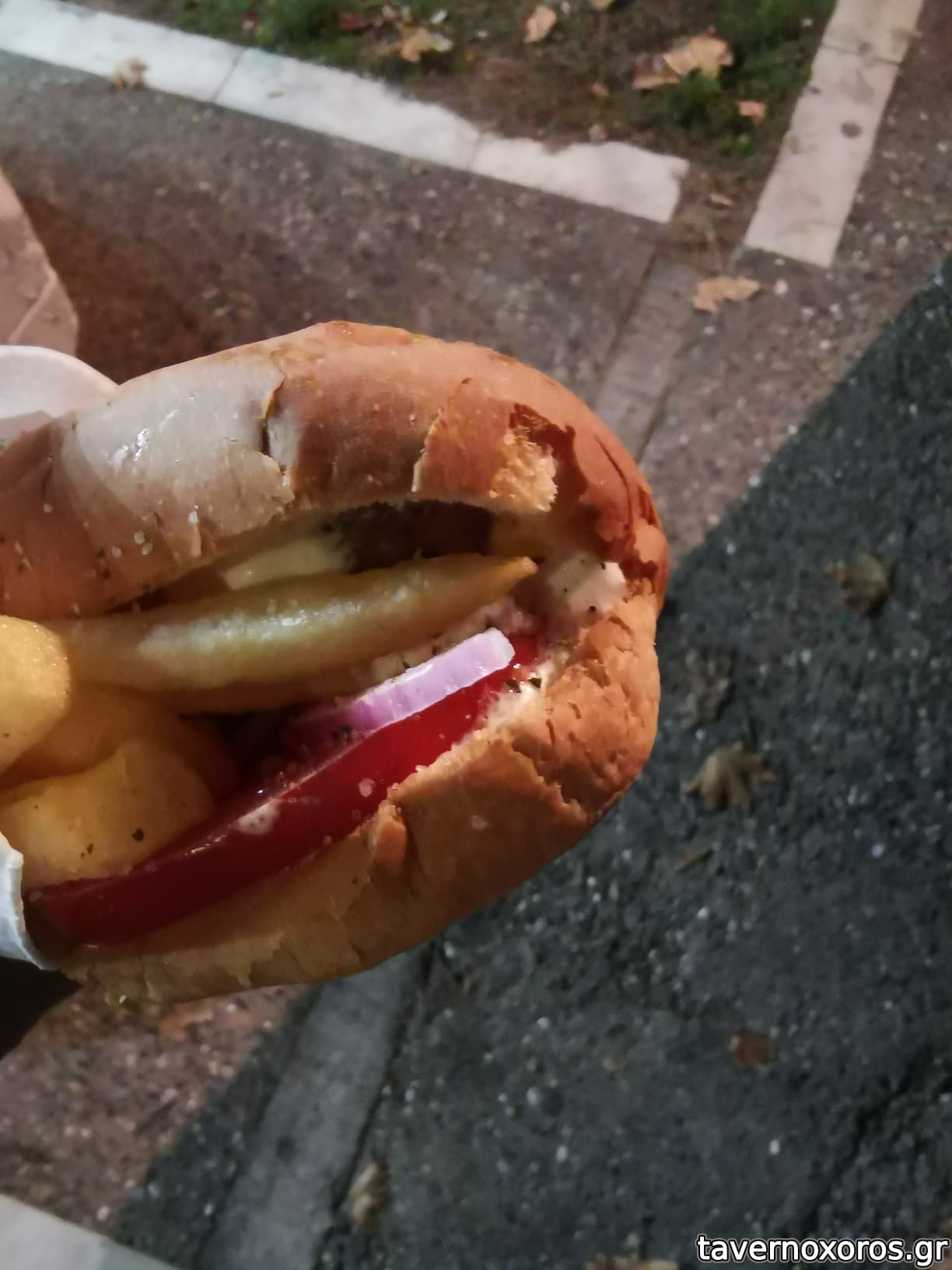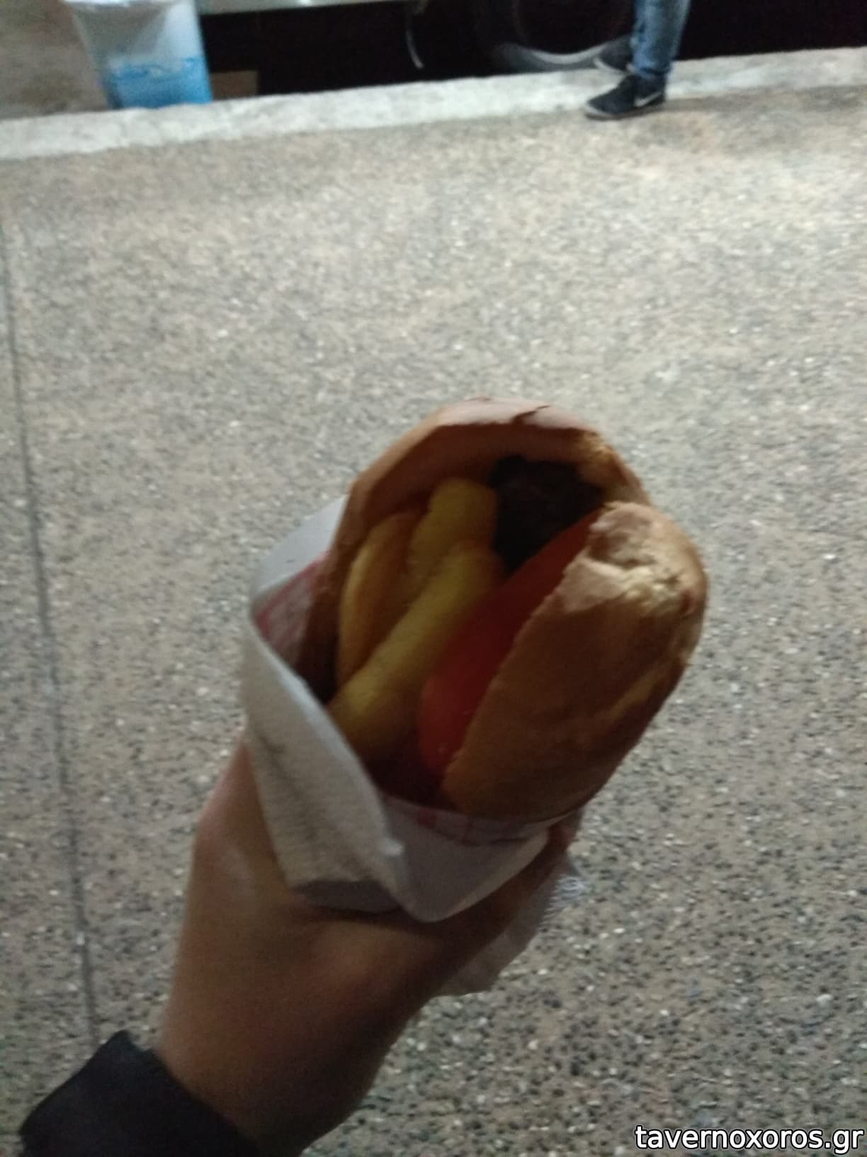 Μεγάλο σαντουίτς, με δυνατό στουκας χωριάτικο λουκάνικο που το ψήνει το μαγκαλάκι του, πατάτες τίμιες, μπούκουβο δυνατό, ντομάτα και ποτέ σάλτσες καθότι αλλοιώνουν τη γεύση. Αυτό το "βρόμικο" είναι καλό.