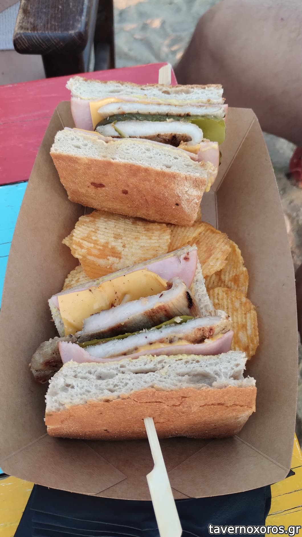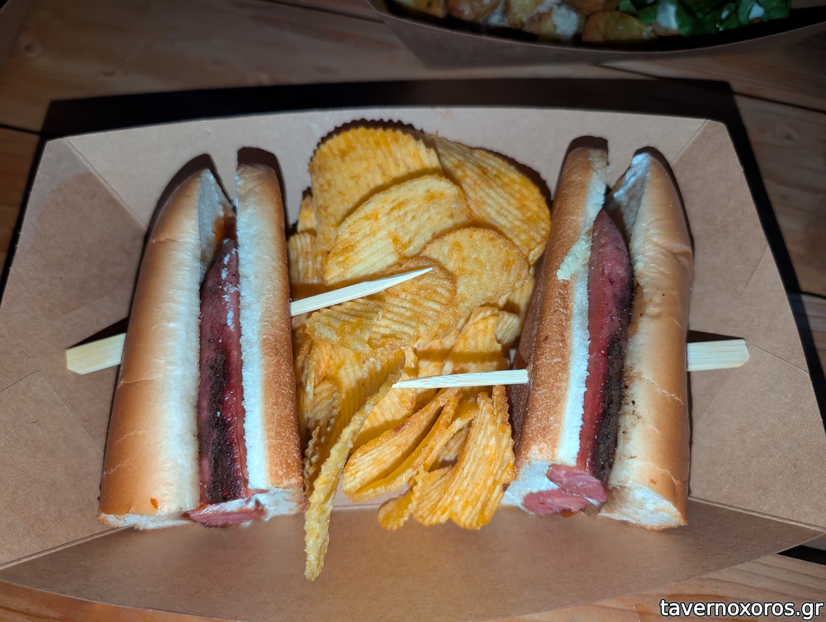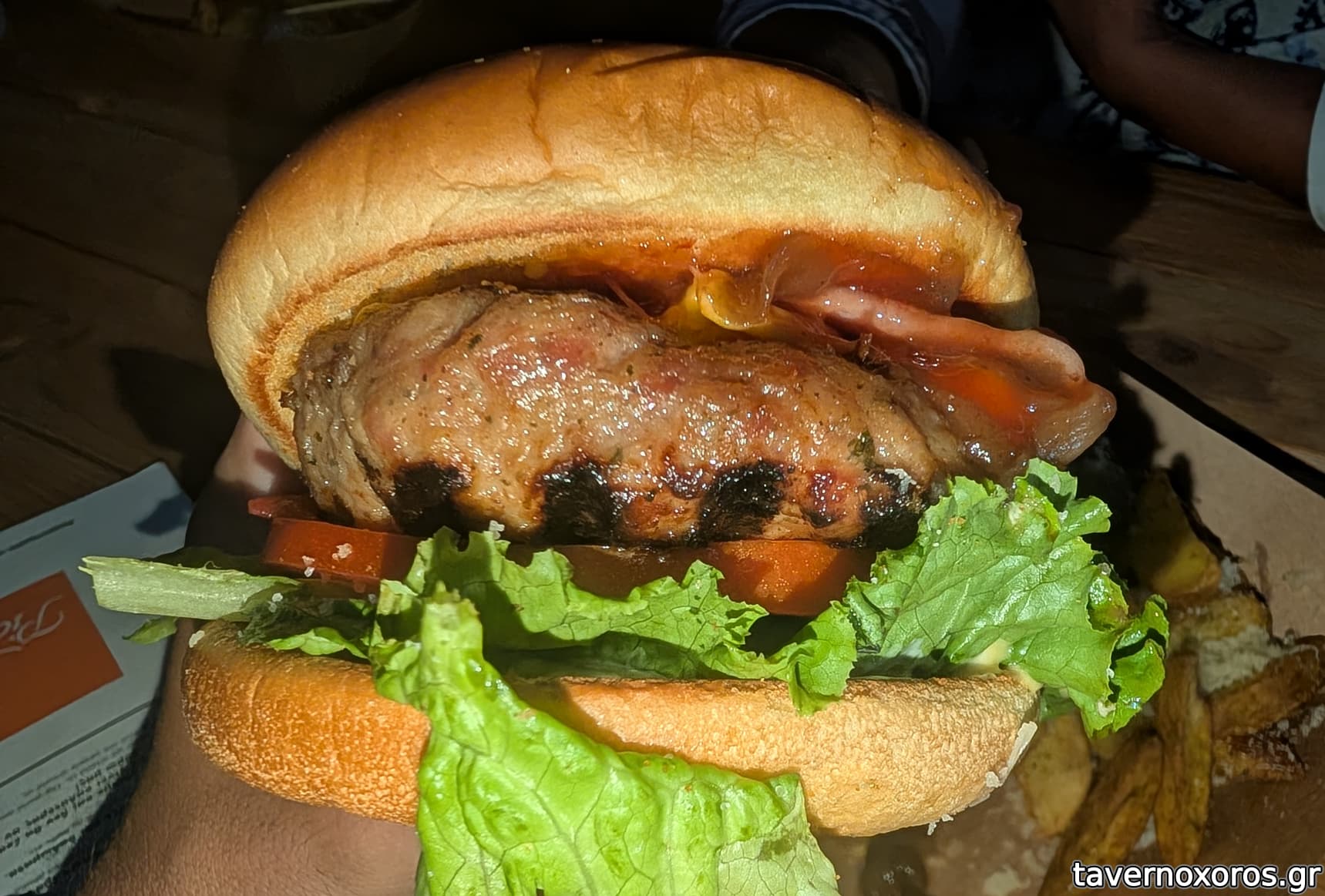 Burger σε ψωμάκι μπριος με ψαρονέφρι, ψητό ανανά, sweet chilli sauce και chips μπανάνας (πολύ καλό!)