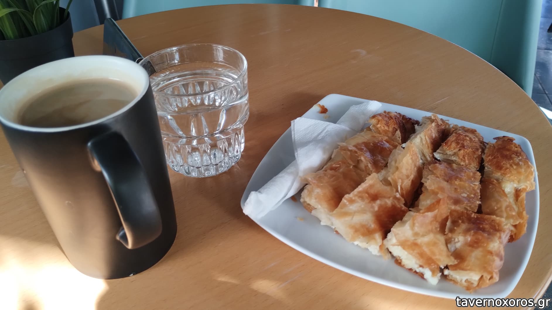 Καφές μαζί με κάποια σνακ. Τα τυροπιτοειδή/ μπουγατσοειδή έχουν ποικιλία και είναι ικανοποιητικά. Στην μπουγάτσα μού έκανε εντύπωση ότι ήταν πολύ καλά ψημένη, χωρίς να είναι, προφανώς, δική τους παραγωγή. (2,30ε)