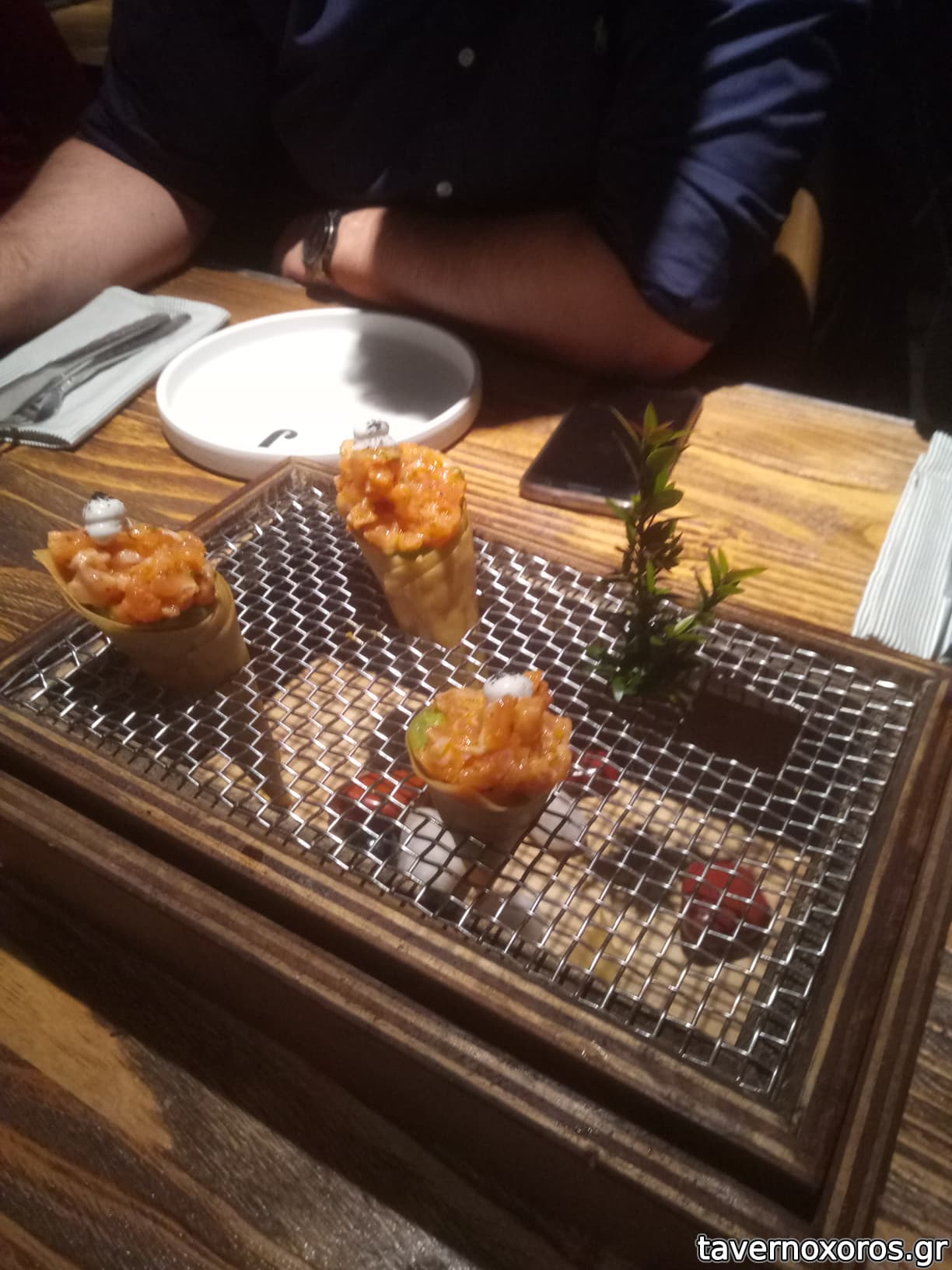 Χωνάκια σολομού και γκουακαμόλε (οκ προσοχή στη λεπτομέρεια: τέσσερις θέσεις τρία χωνάκια γιατί είμασταν τρεις)