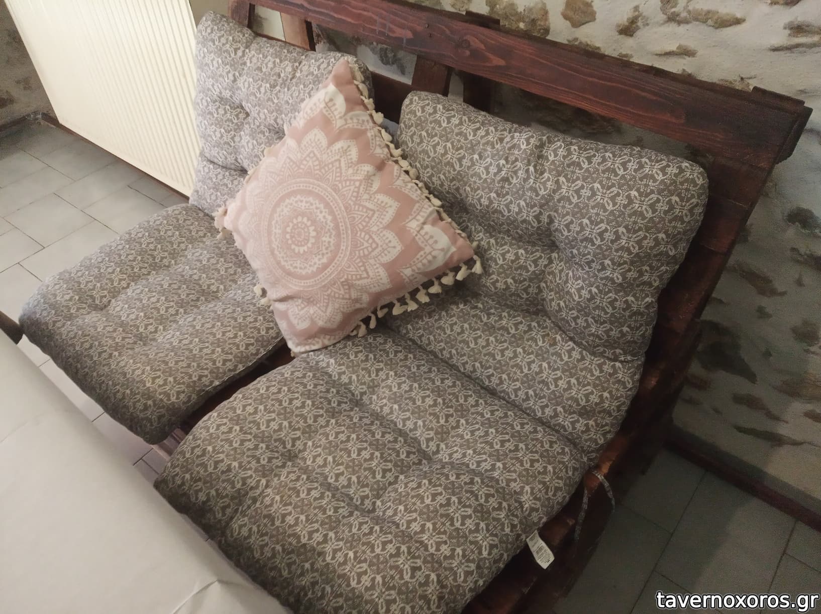 Καθίσαμε στόν καλοκαιρινό χῶρο τόν καλυμμένο μέ ψάθα στηριγμένη σέ μία μεγάλη ξύλινη κατασκευή ἐξαιρετική μέ φυσικό ξύλο.