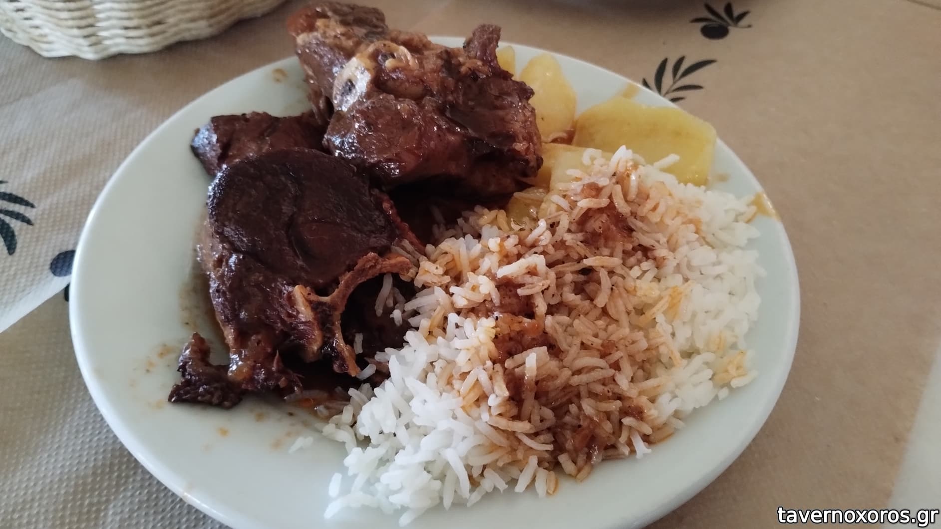 Πρόβειο κοκκινιστό, με γαρνιτούρα ρύζι και πατάτες φούρνου (πολύ μαλακό και νόστιμο. Άξιζε!)