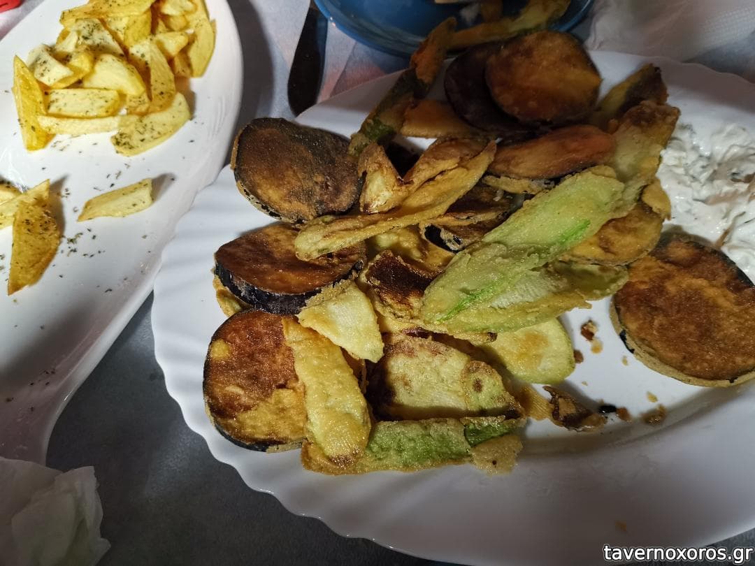 Πατάτες φρέσκες ενώ τα κολοκυθάκια και οι μελιτζάνες τηγανισμένες χωρίς να στάζουν+ρετσίνα κεχριμπάρι καλή.