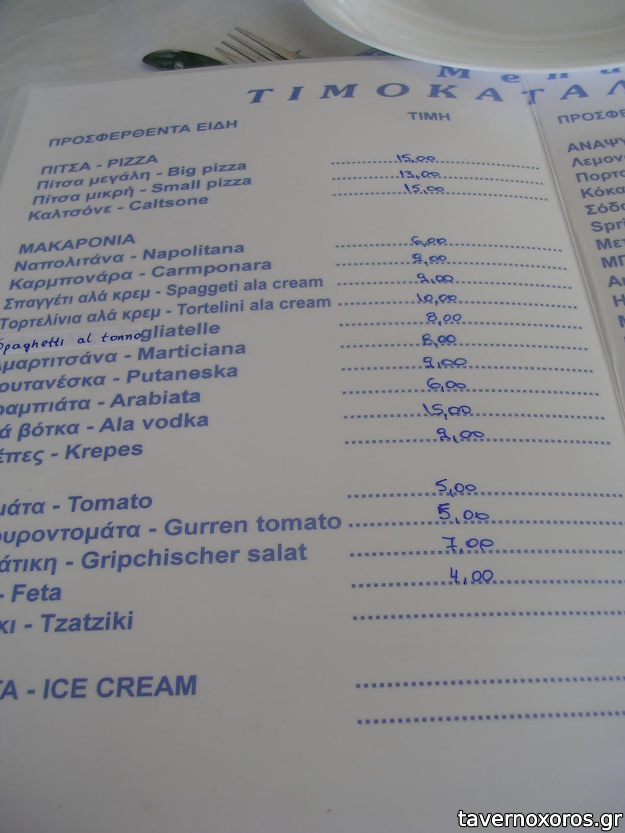 15€ η πιτσα, 12/10 οι μακαροναδες, 8 η σαλατα.