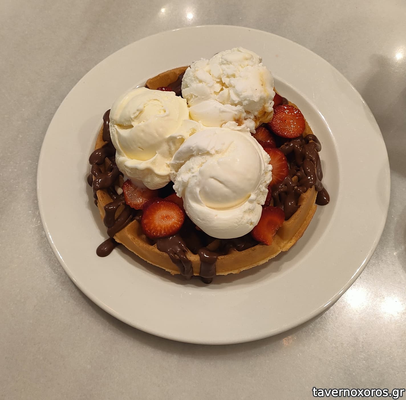 Βάφλα με φράουλες και παγωτό (πολύ καλή)
