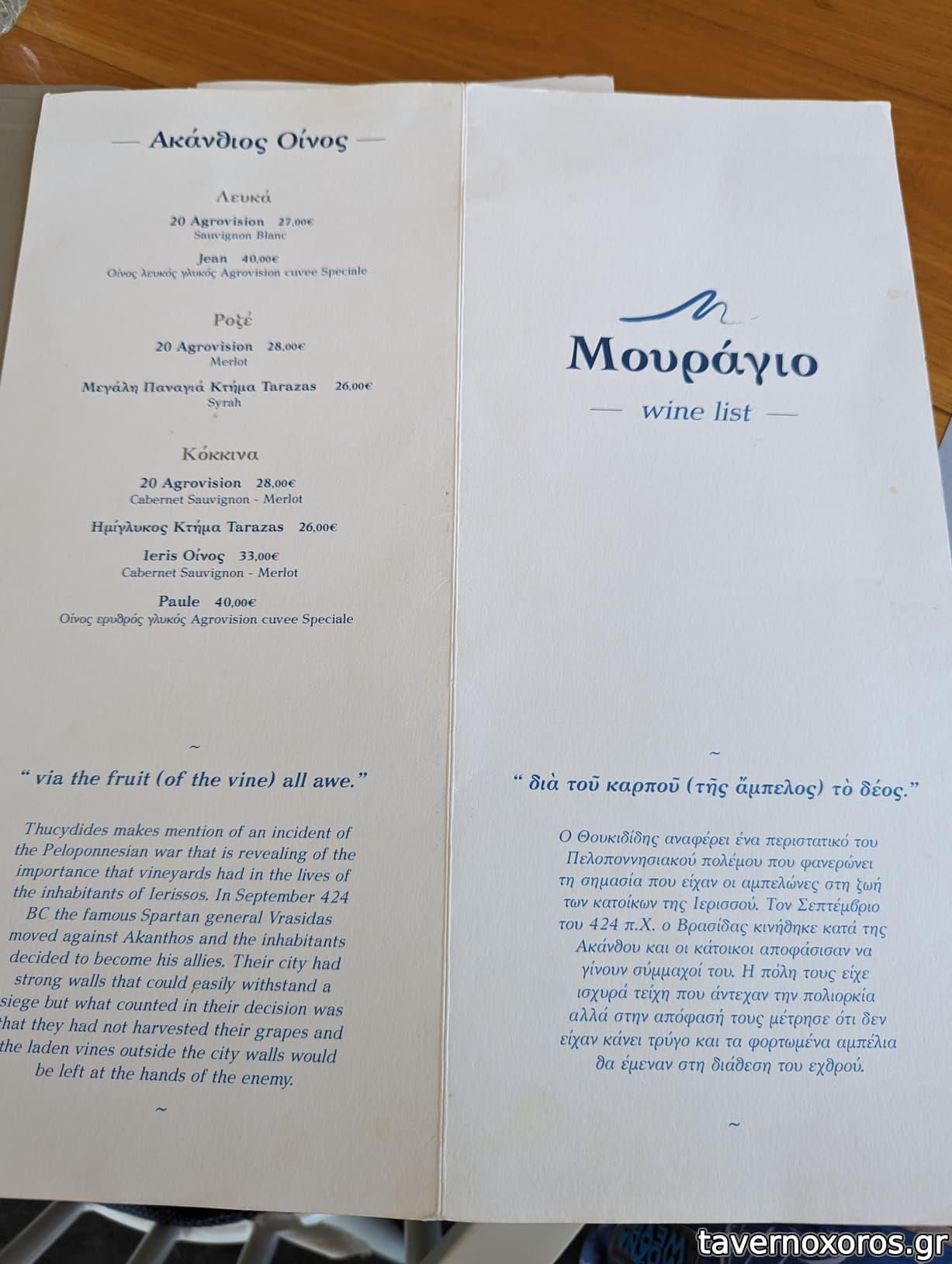 Στο Μουράγιο που ρωτήσαμε ήταν όλα ρεζερβέ!! Είδε την απογοήτευση στα μάτια μας και έβγαλε τραπεζάκι από την αποθήκη (μη συμβατό με τα άλλα) το έστρωσε και μας σέρβιρε. Η διαφορά του πως πρέπει να είναι ένας μαγαζάτορας με το πως είναι η κάμπια. Ζητήσαμε ορκίνι (μας ορμήνεψε φίλος από Ιερισσό), κάτι σαν τοπικό παστό, αλλά δυστυχώς δεν είχε. Έφερε όλα τα άλλα. Μια τίμια επιλογή με νορμάλ τιμές. Ήπια ντόπιο τσίπουρο με γλυκάνισο (2 καραφάκια μόνος μου) και ήμουν μια χαρά. Μετά βγήκα για ποτάκια και την άλλη μέρα καθόλου παρενέργειες.