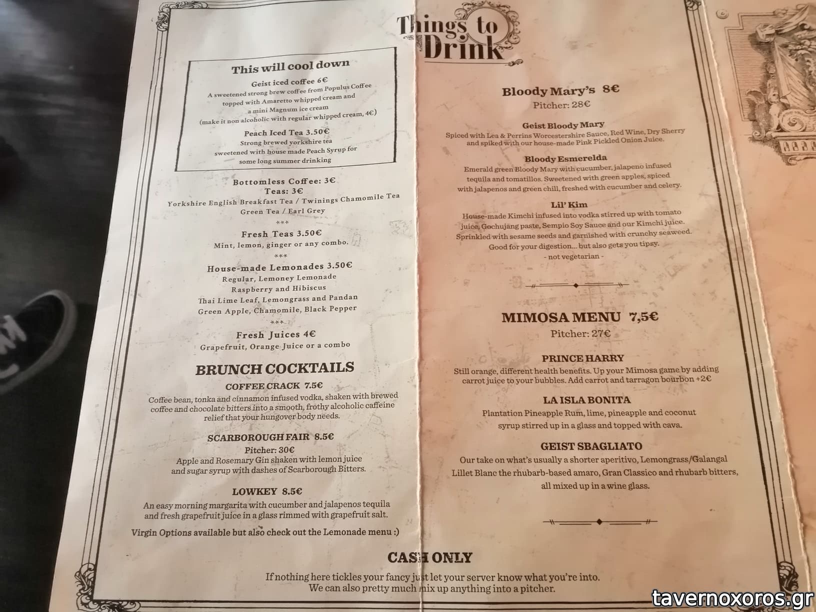 Από τον κατάλογο των brunch cocktails, προτείνεται για hangover: coffee crack (coffee bean, tonka and cinammon infused vodka, shaken with brewed coffee and chocolate bitters)