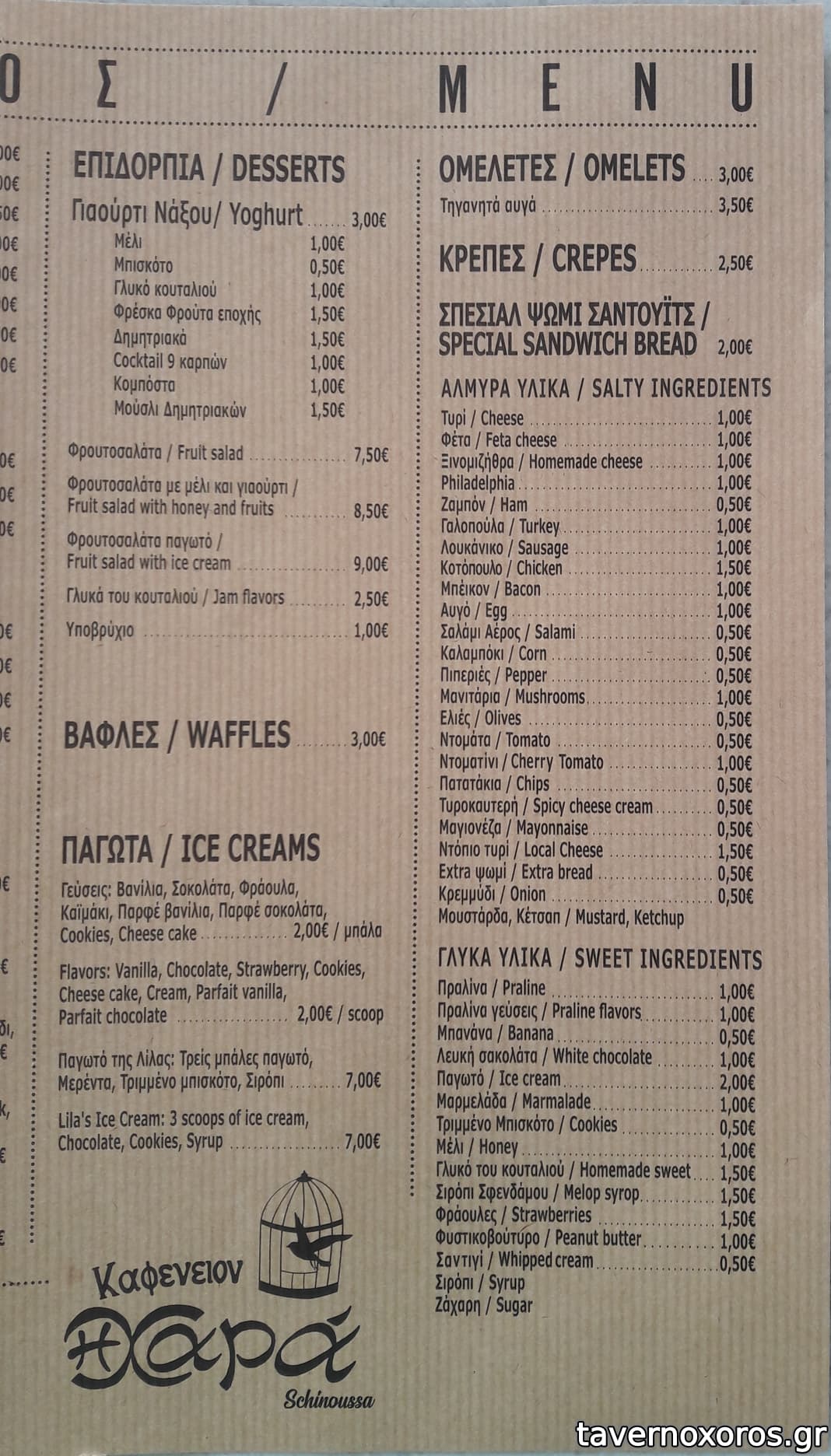 Πολύ όμορφο, old school καφεδάκι, λειτουργεί από το πρωί ως το βράδυ, πάνω στο κεντρικό πεζόδρομο της Σχοινούσας. Αξίζει όλες τις ώρες της ημέρας, στο πρωινό του η ομελέτα ήταν καταπληκτική, τα γλυκά τους επίσης πολύ νόστιμα. Είναι must να περάσεις από εδώ.
