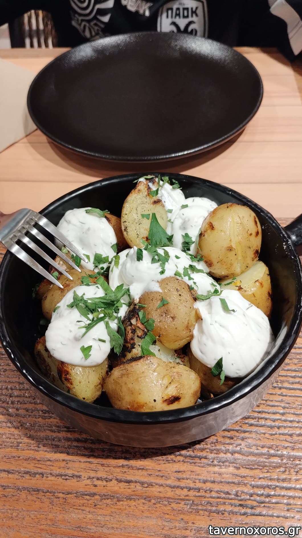 Πατάτες baby (μέτριες, γιατί ήταν απλώς βραστές με σως γιαουρτιού. Θα ήθελα λάδι ή ζωμό γύρω τους)