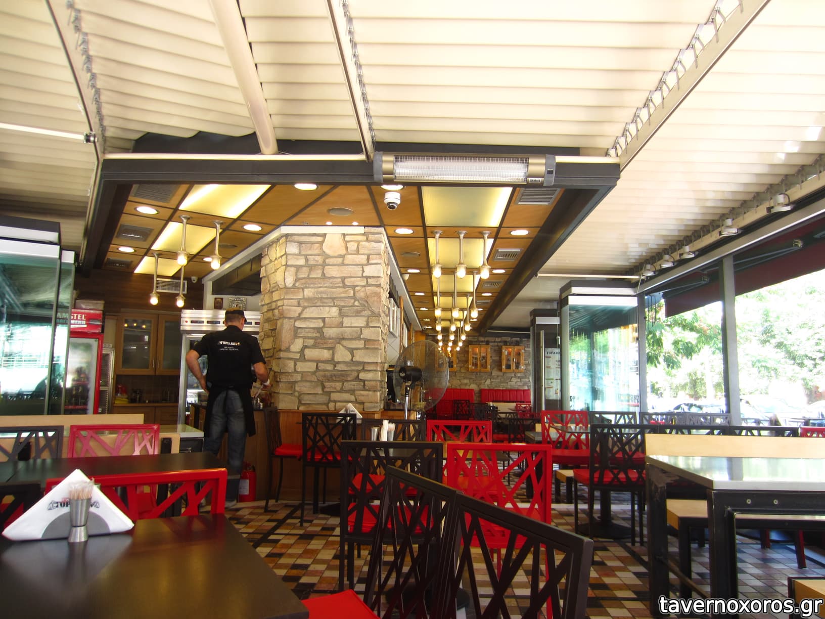 Σε μερικά τραπέζια αντί γιά καρέκλες , έχουνε σιδερένιους πάγκους με ξύλινη βάση και πλάτη που είναι ΠΟΛΥ κουραστικοί [ Άραγε προσπαθούνε να σε διώξουνε νωρίτερα γιά να καθίσουν οι επόμενοι πελάτες ?? ]