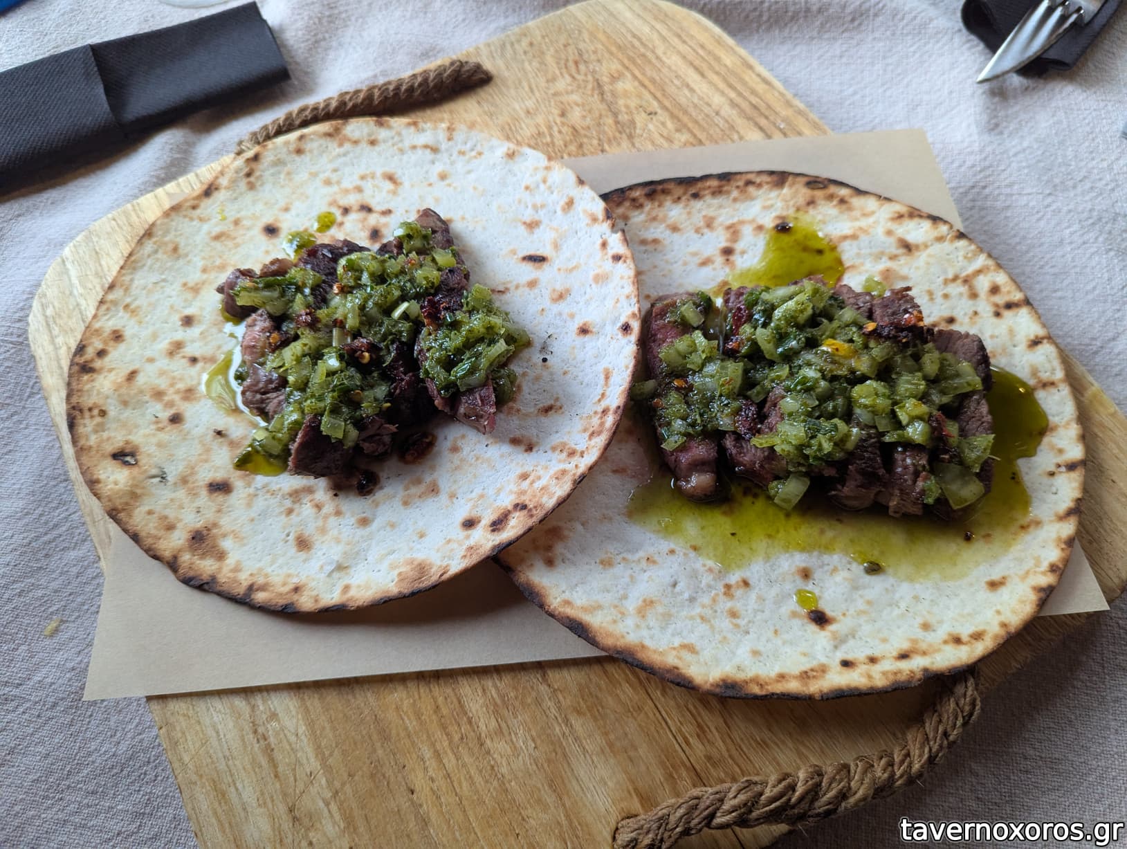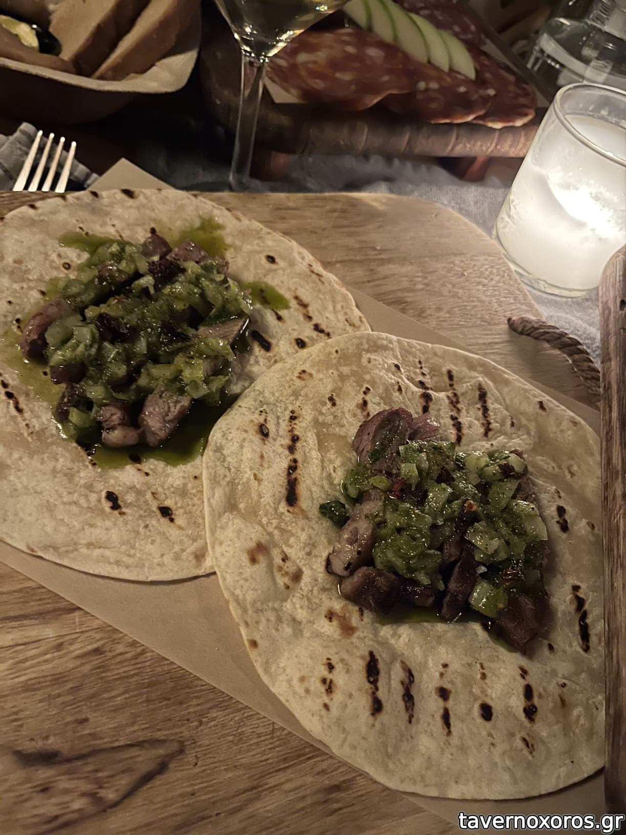 Tacos beef πήραμε κι εμείς και ήταν μια χαρά, παρότι τσιμπημένα (μού άρεσε το chimichurri). Επίσης μια μεριδούλα πατάτες τηγανητές με truffle mayo και σχοινόπρασο (κάπως νωθρές μαλακωμένες οι πατάτες, αλλά μια χαρά για συνοδεία κοκτέιλ)