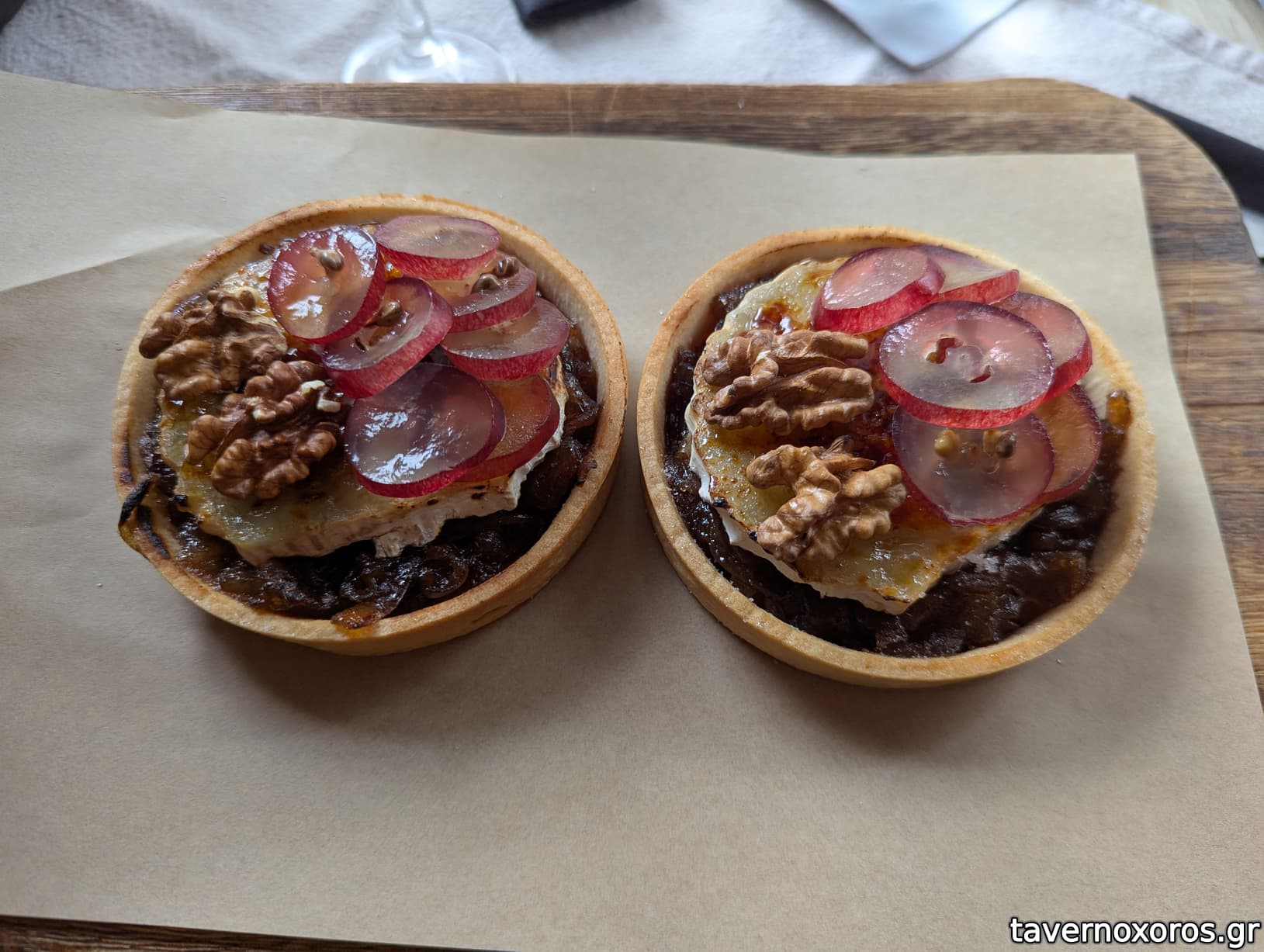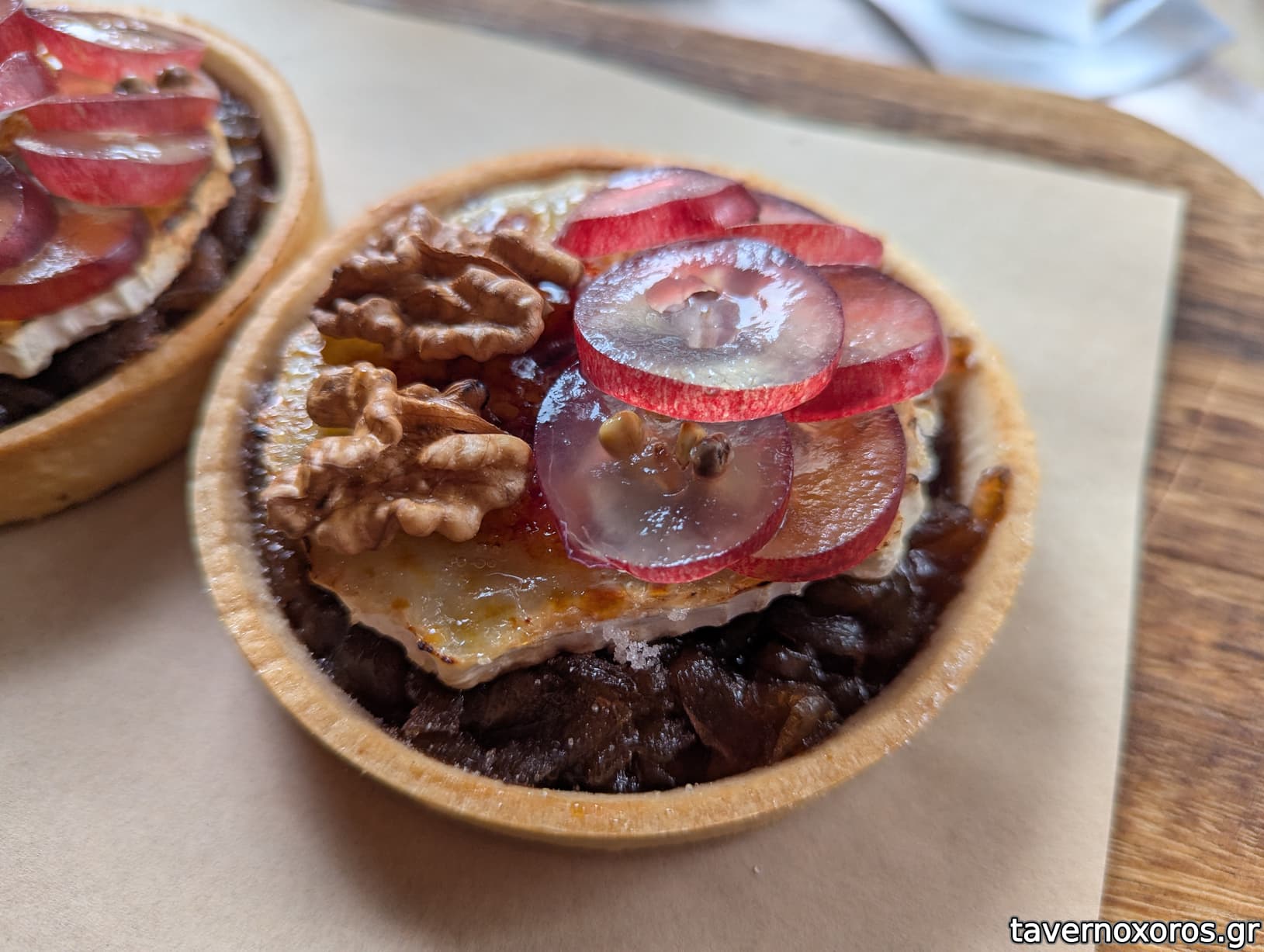Η τάρτα με καραμελωμένα κρεμμύδια ήταν πάρα πολύ γλυκιά που οριακά τρωγόταν, εκτός αν την πάρεις για γλυκό. Πάνω από το chevre είχαν καραμελώσει και ζάχαρη οπότε μαζί με τα κρεμμύδια συνολικά ήταν πολύ γλυκό. Η βάση ήταν νόστιμη και μου φάνηκε ότι μόλις την έψησαν.