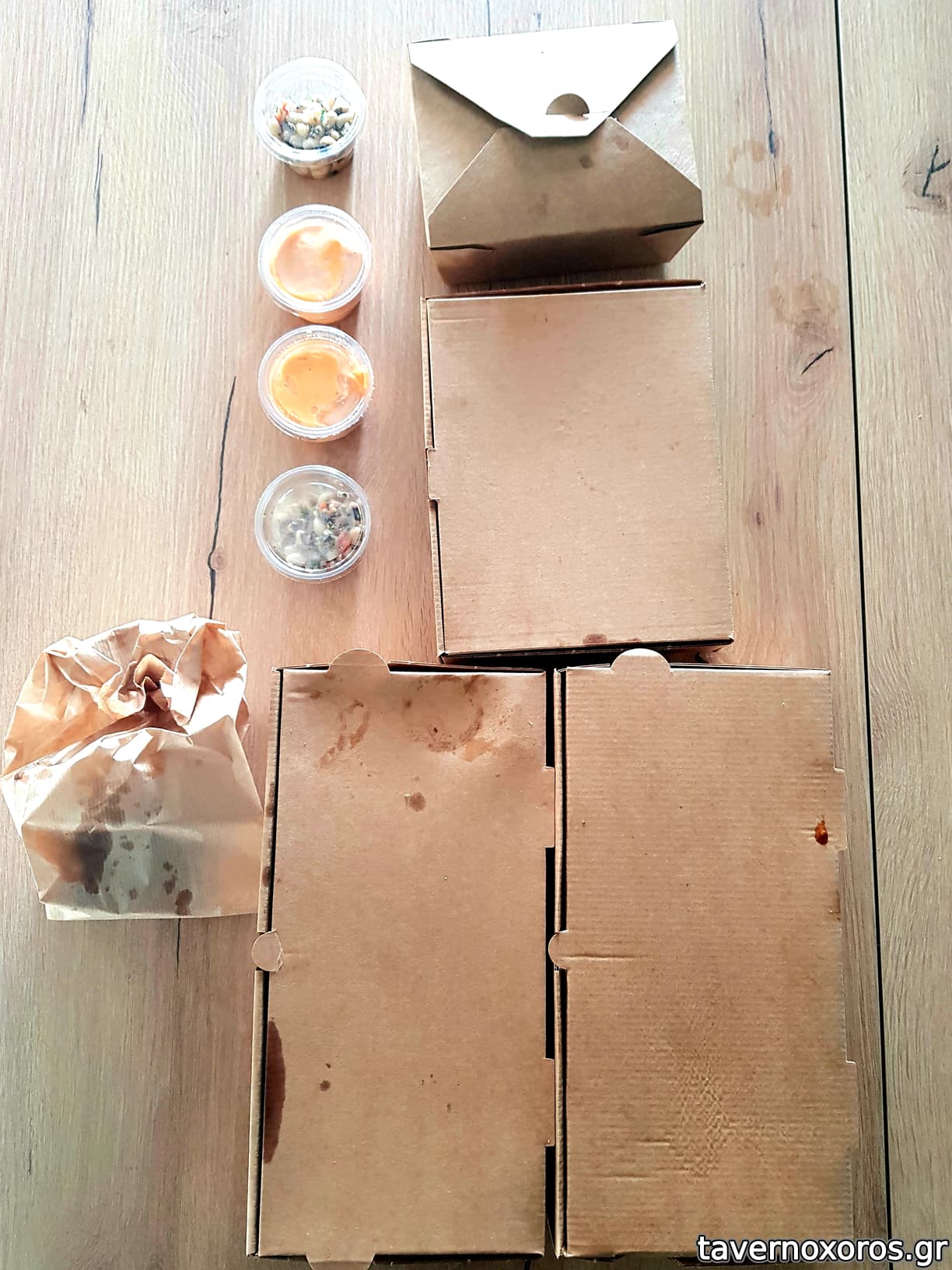 Η παραγγελία ήρθε σε χάρτινες συσκευασίες (που έχει τα καλά και τα κακά του) και τα sides σε πλαστικά μικρά μπολάκια.