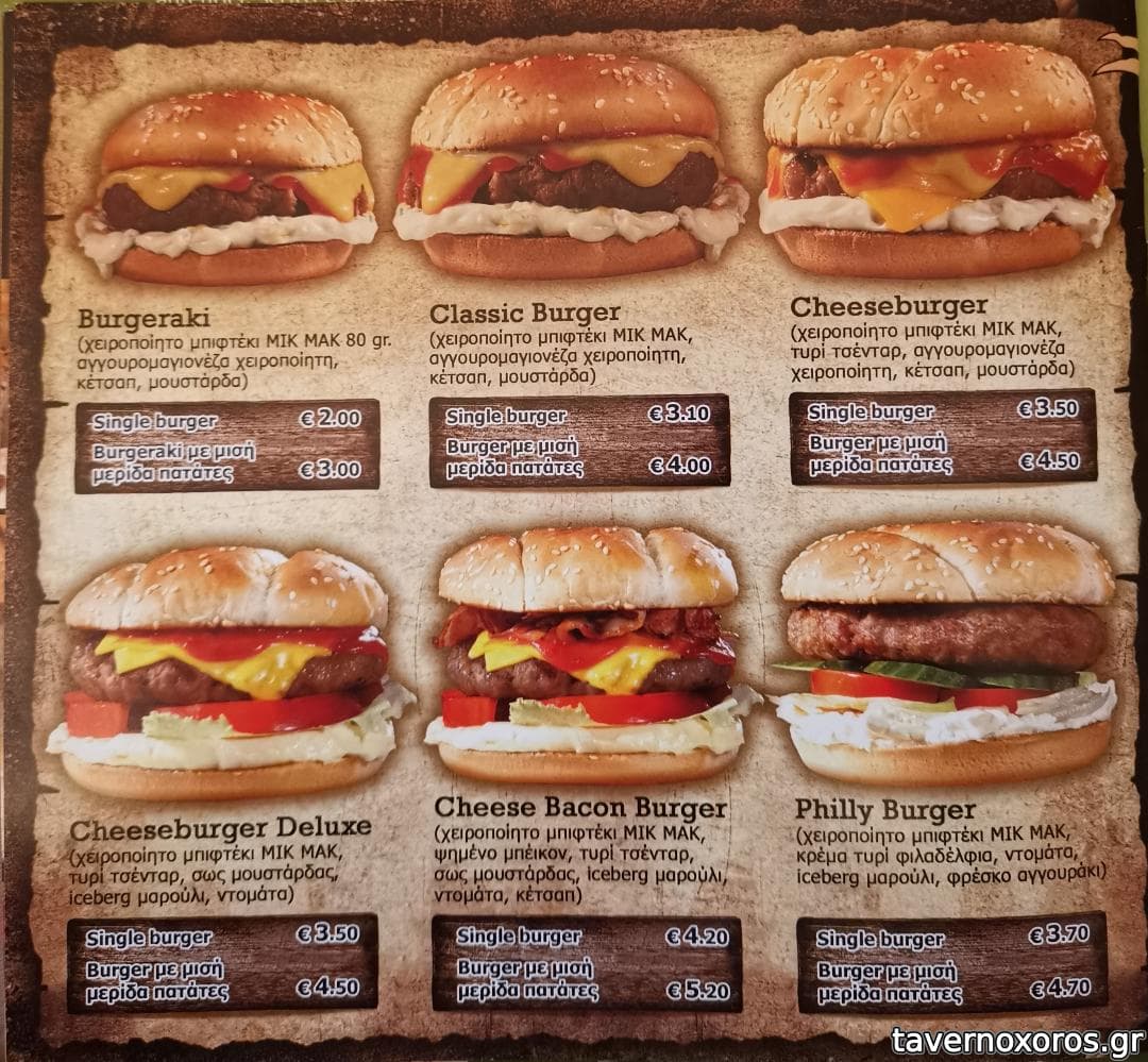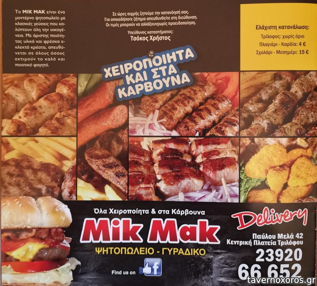 | Λέξεις κλειδιά | Μικ Μακ, #burgers, #σουβλάκια, #σουτζουκάκια, #μπιφτέκι, #πανσέτα, #λουκάνικο, #κοτόπουλο, #σάντουιτς, #hotdog, #club sandwich, #χαλούμι, #πάπρικα, #κολοκυθοκεφτέδες |