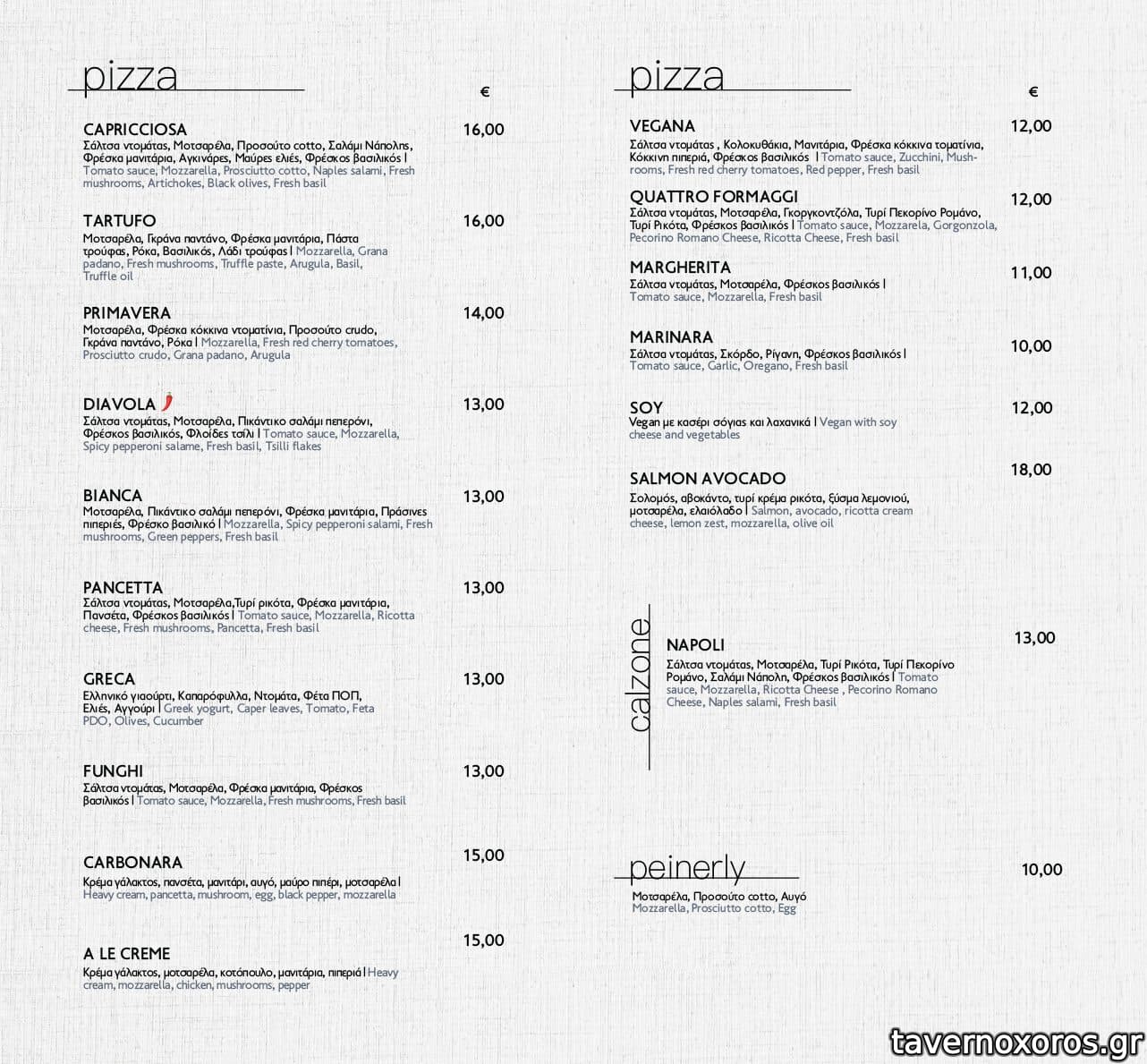 Η pizza "Margherita" ναπολιτάνικου τύπου με λεπτό ζυμάρι και μαστιχωτή υφή, αρκετά καλή, όμως λίγο περισσότερο λαδερή απ' ό,τι έπρεπε ενώ την ίδια, περίπου, θετική εντύπωση μου έκανε και η "Pancetta". Χρησιμοποιούν ποιοτική πρώτη ύλη και το αποτέλεσμα είναι αρκετά δεμένο στην εκτέλεση κάτι που καταλαβαίνει κανείς στη δοκιμή ενώ οι τιμές, πάνω - κάτω, είναι φυσιολογικές σε σχέση με τις υφιστάμενες γενικώς.
