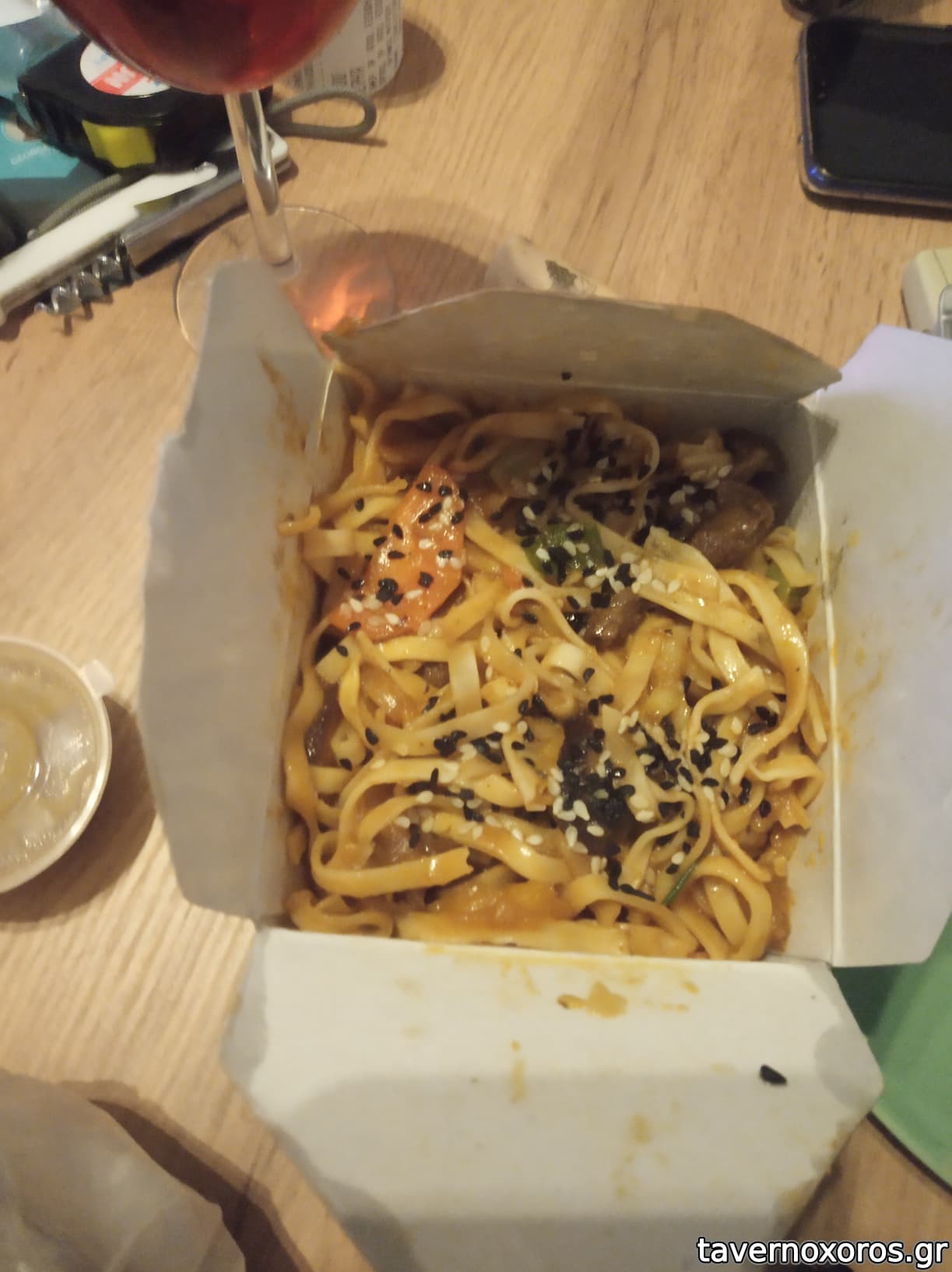Νoodles με φυστικία κάσιους (πολλή κι εμφανής η sweet chili sauce στο πιάτο)