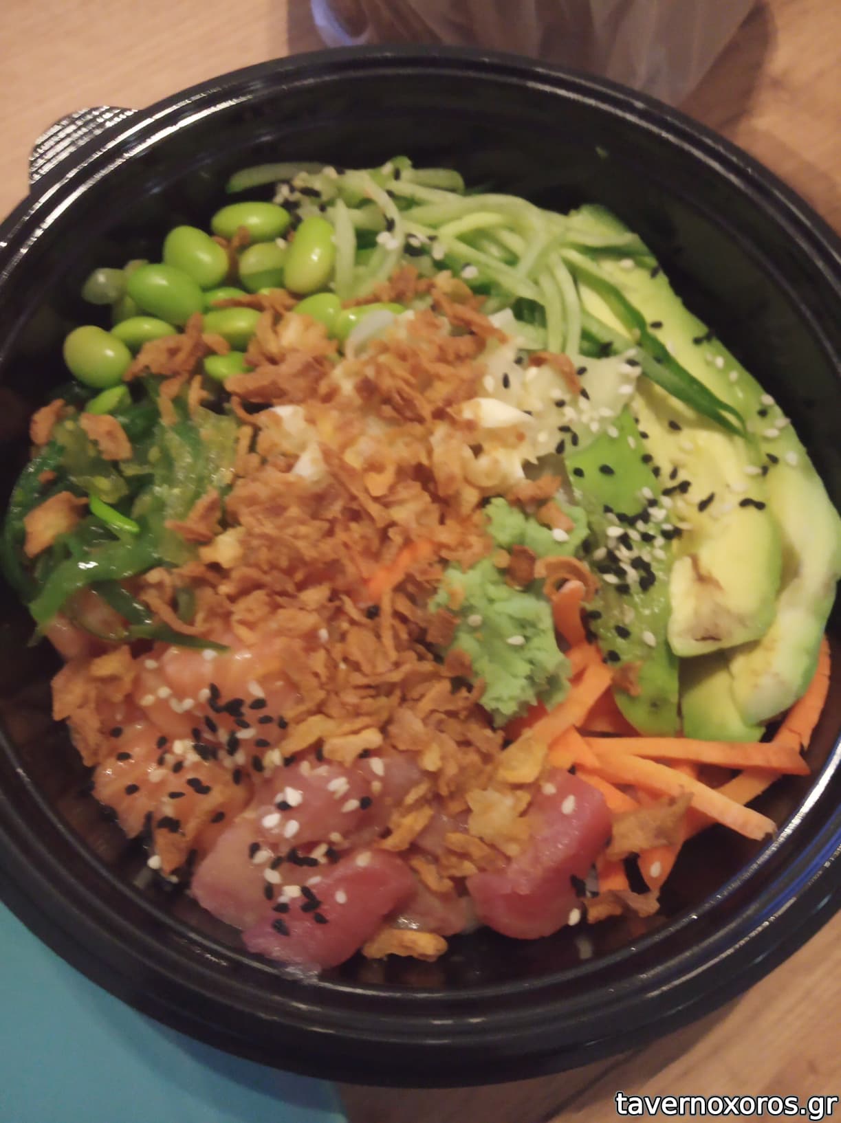 Poke bowl μεγάλη μερίδα, χορταστικό και το συμπάθησα! Έχει μόνον ένα στυλ. Διάφορες υφές μέσα, είχε και wasabi που σε σόκαρε.. Η παρέα το ονόμασε "