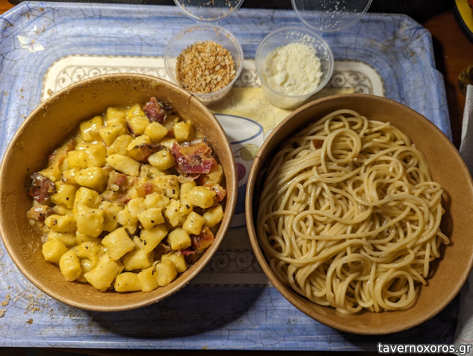 Νιόκι καρμπονάρα με γκουαντσάλε και σπαγγέτι Aglio Olio e Peperoncino (πολύ δυνατά και τα 2)