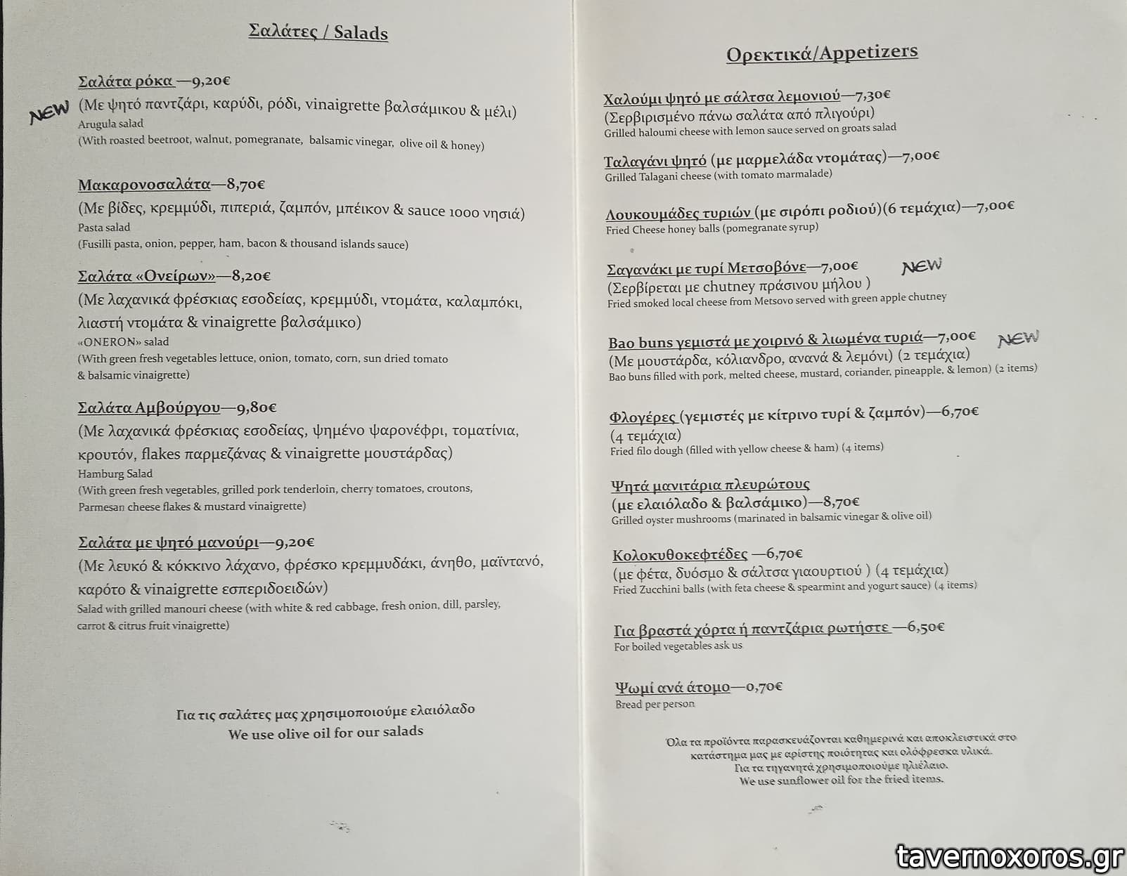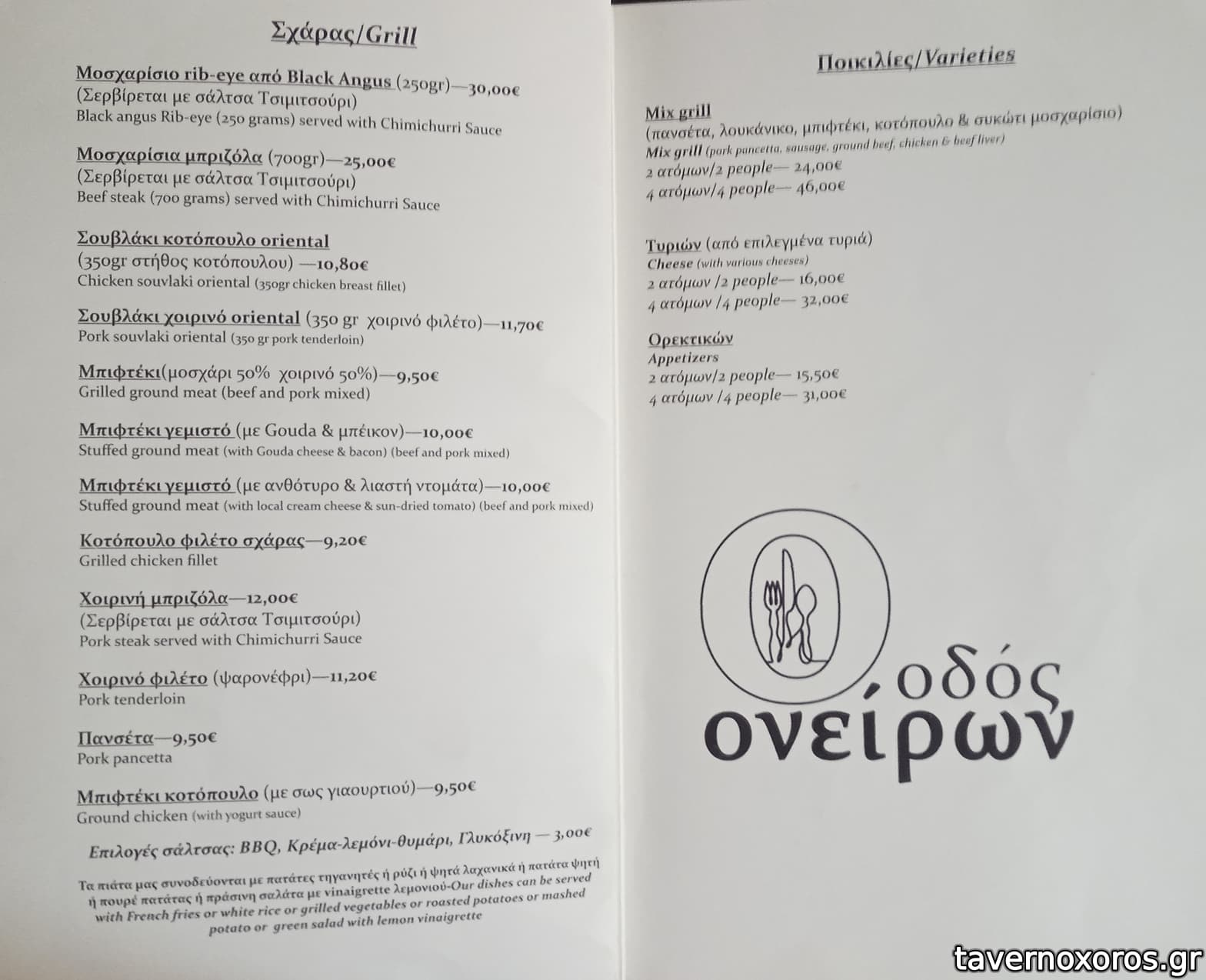 Απρίλιος 2025, άτομα 8, πήραμε 1 σαλάτα ρόκα με ψητό παντζάρι, καρύδι, ρόδι, βινεγκρέτ βαλσάμικου και μέλι, 1 σαλάτα με ψητό μανούρι, λευκό & κόκκινο λάχανο, κρεμμυδάκι, άνηθο, μαϊντανό, καρότο και βινεγκρέτ εσπεριδοειδών, 1 σαλάτα «Ονείρων» με μαρούλι, ντομάτα, κρεμμύδι, καλαμπόκι, λιαστή ντομάτα και βινεγκρέτ βαλσάμικου, 1 ψητά μανιτάρια πλευρώτους με ελαιόλαδο, βαλσάμικο και σουσάμι, 1 ταλαγάνι ψητό με μαρμελάδα ντομάτας, 1 σαγανάκι με τυρί μετσοβόνε και τσάτνεϊ πράσινου μήλου, 1 ριζότο λαχανικών με κολοκύθι, μελιτζάνα, πιπεριά, μανιτάρια και κρεμμύδι, 1 κολοκυθοκεφτέδες με φέτα, δυόσμο και σάλτσα γιαουρτιού, 2 γλυκόξινα φιλετίνια κοτόπουλο με σάλτσα από χυμό πορτοκάλι και χυμό ανανά, κάσιους και πολύχρωμες πιπεριές, 2 μπιφτέκια μισό μοσχάρι μισό χοιρινό με φρέσκιες τηγανητές πατατούλες και ντιπάκι γιαούρτι, 2 χοιρινά μενταγιόν με σάλτσα από γλυκό κόκκινο κρασί και μετσοβόνε, 1 χτένι μοσχαρίσιο με σάλτσα μανιταριών και διάφορες πιπεριές, 2 μπύρες, 2 αναψυκτικά και ψωμάκι (βλ. φωτο).
