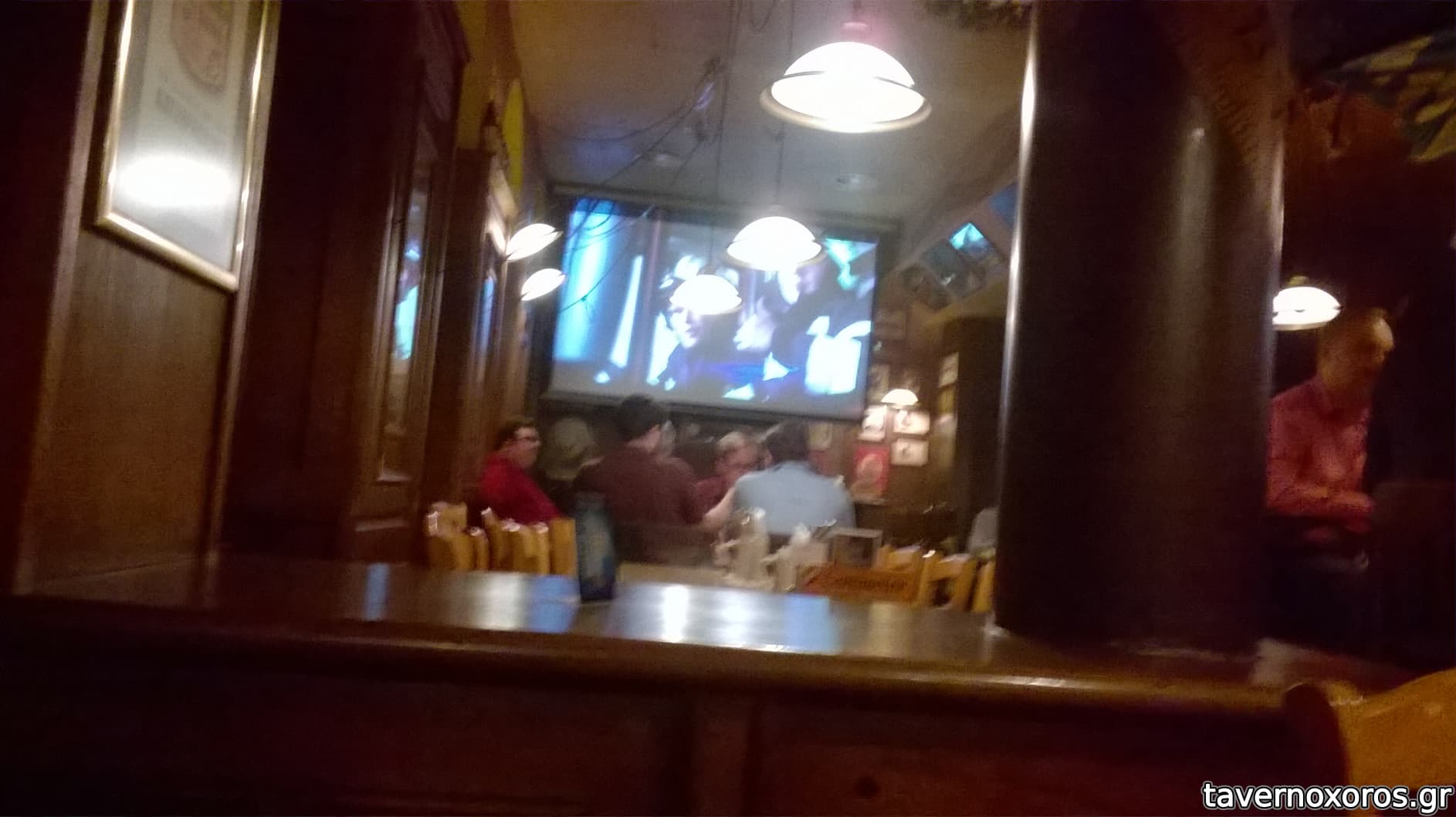 Σημειωτέον ότι η τηλεόραση μετέδιδε ποδόσφαιρο αλλά στο mute για να μην ενοχλούνται οι υπόλοιποι, εκτός φιλάθλων, θαμώνες.