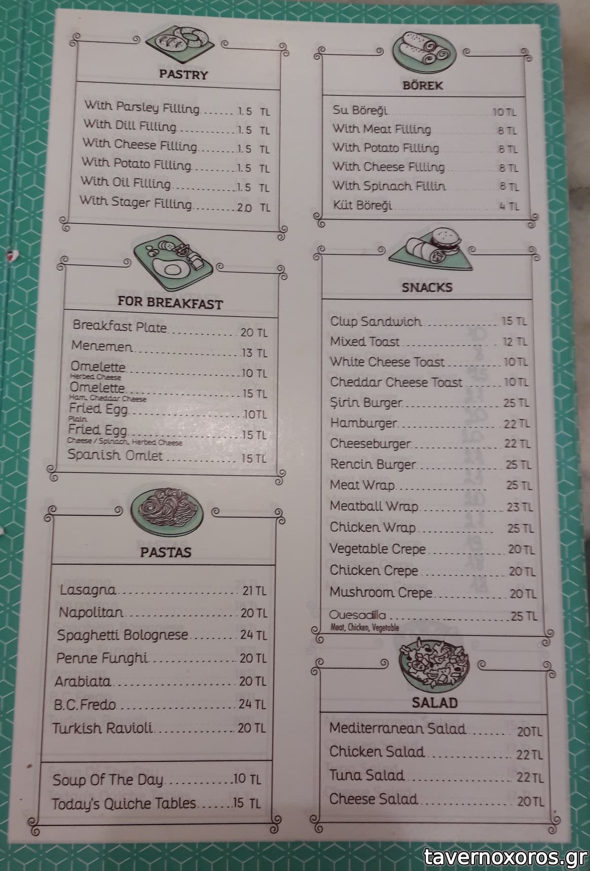 Ένα μικρό διαμαντάκι που σερβίρει από μπουρέκια μέχρι ομελέτες και λαζάνια λαχανικών. Δοκιμάστηκαν μπουρέκια με κιμα, σπανάκι, και τυρί, κουρου σπανακοτυροπιτάκια, εργολάβοι, πουγγιά σοκολάτας και μπακλαβάς και ήταν όλα από καλά μέχρι εξαιρετικά.