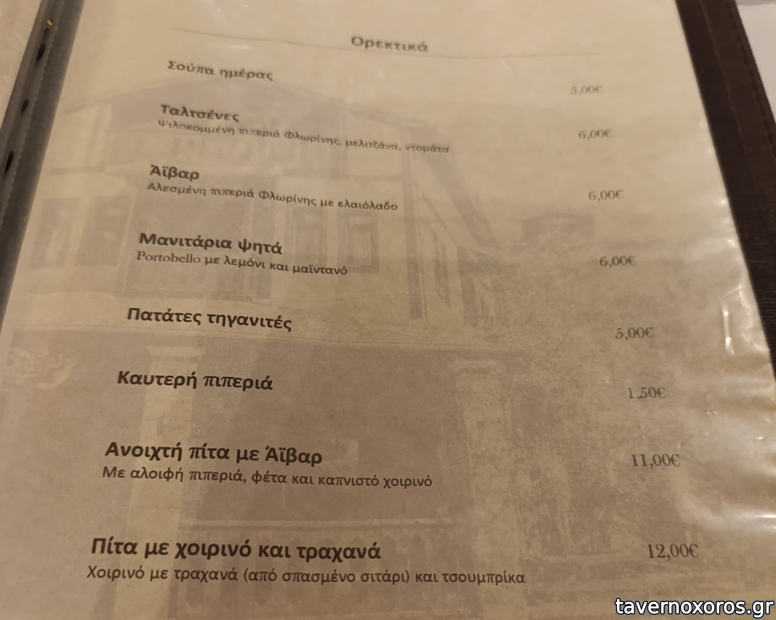Δοκιμάσαμε ανοιχτή πίτα με πιπεριά (καλή και ελαφρώς πικάντικη), φλωρινέλα (καλή), μια πράσινη σαλάτα (τζενέρικ) και 6 κυρίως και ημέρας (όλα πολύ καλά).