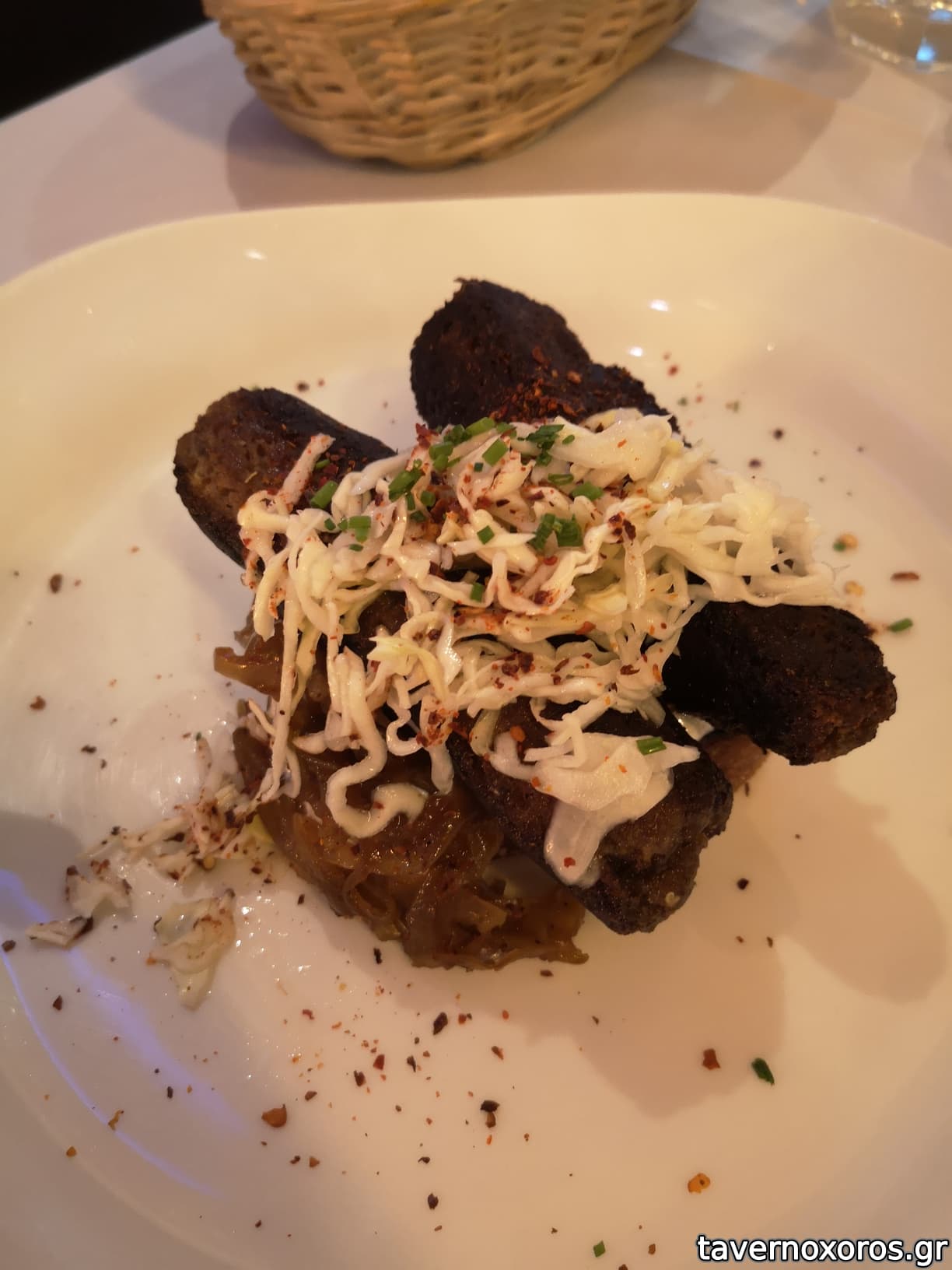 Σουτζούκι με πρόβειο και μοσχαρίσιο κιμά, πάνω σε ψωμάκι, με καραμελωμένα κρεμμύδια και πικάντικη σαλάτα (νόστιμο το σουτζούκι, τα υπόλοιπα απλώς οκ)