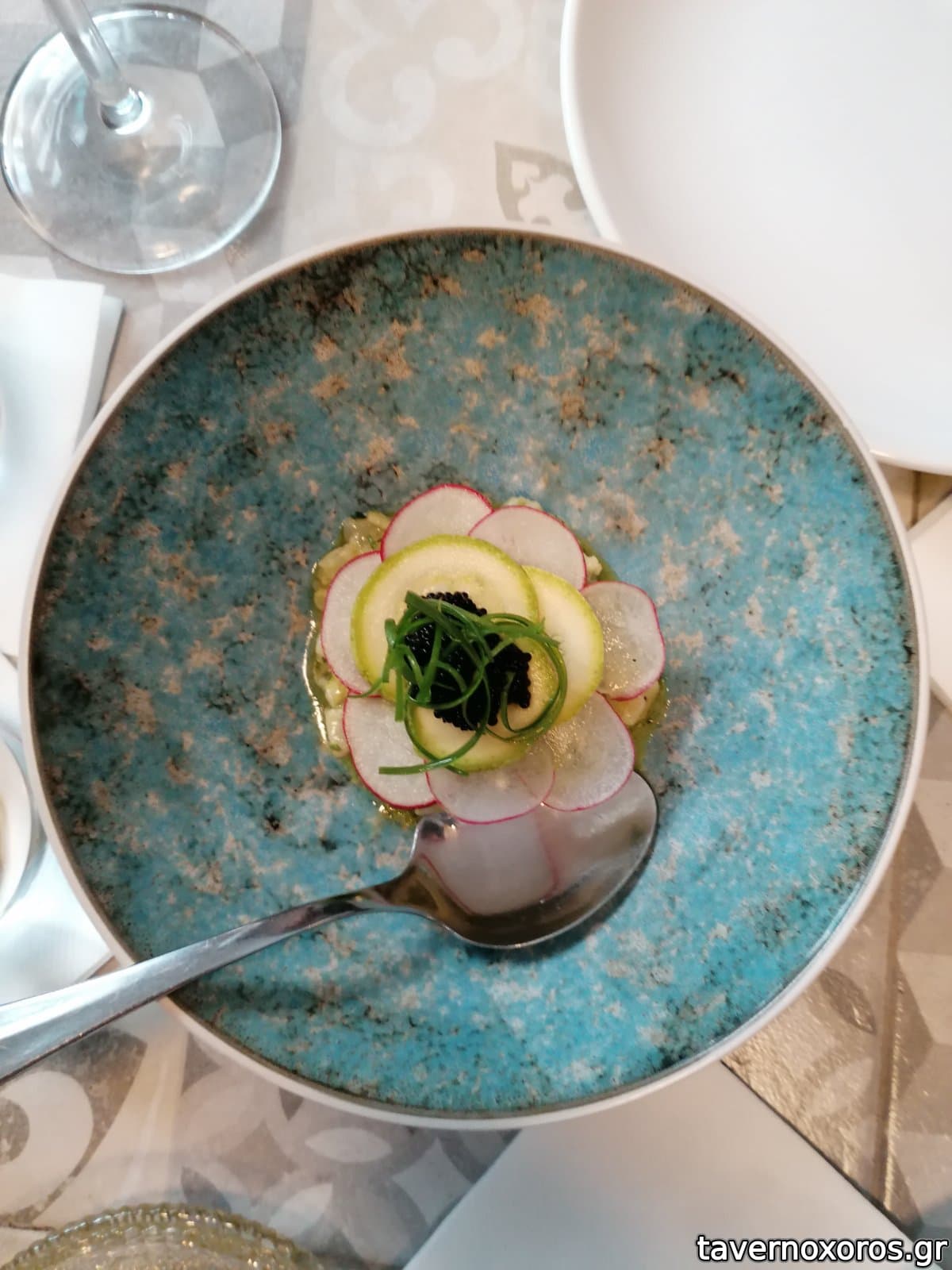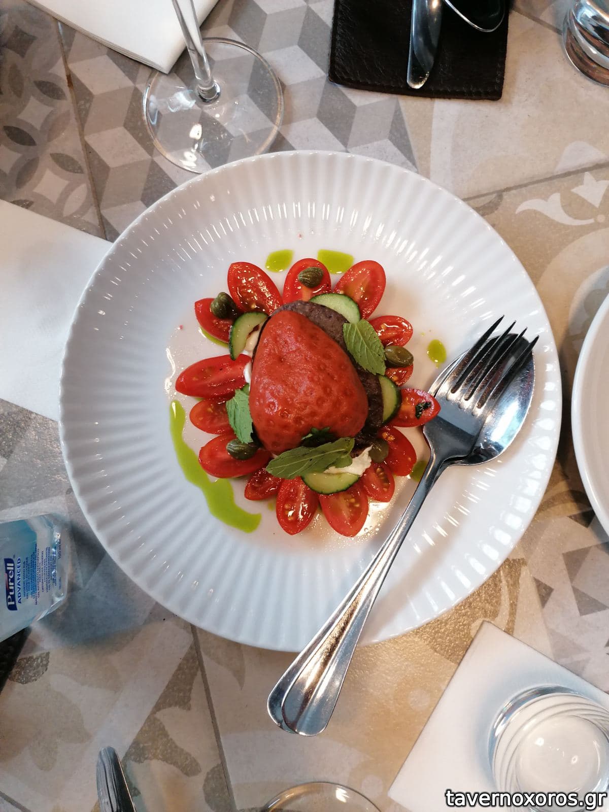 Μοιραστήκαμε, κατά πρότασή τους (!) ένα πρώτο κι ένα κυρίως. Το πρώτο ήταν μαγιάτικο μαριναρισμένο με ραπανάκι και φράουλα, το δεύτερο κατσικάκι με φάβα και μια πολύ ωραία σύνθετη σάλτσα. Υπέροχα και τα δύο. Καταλήξαμε να φάμε κι επιδόρπιο, παρότι συνήθως το αποφεύγουμε, επίσης πάρα πολύ ωραία - ένα βασισμένο στον μούστο και το άλλο, σορμπέ αμύγδαλο (μμμμμμ) με κρέμα τριαντάφυλλο. Με δυο ποτήρια κρασί (ένα λευκό που δε γνώριζα, Ροδίτη Μακεδονίας, μας ενθουσίασε) και τα κερασμένα ψωμί-ταραμοσαλάτα-ελιές πληρώσαμε από 40 ευρώ. Για αυτή την ποιότητα φαγητού δεν το βρήκαμε υπερβολή. Στην Αθήνα έχω πληρώσει ανάλογες τιμές για πολύ πιο μέτρια γεύματα.