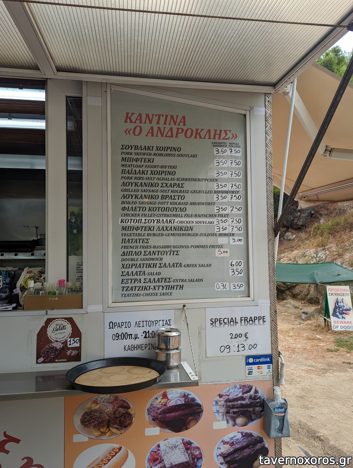 Πολυ ευγενικη η κυρια μεσα στην καντινα που ετοιμαζε τα εδεσματα. Ο γιος σερβιρε, και ο συζυγος αραζε με μια παρεα σε ενα τραπεζι και επινε μπυριτσες στην δροσουλα.