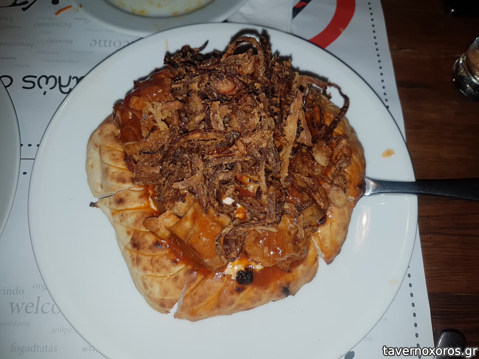 "Χοιρινά σκαλοπίνια σε ποντιακή πίτα, με δροσερή σως γιαουρτιού & τηγανιτά κρεμμύδια" (απλώς οκ, δεν θα το ξανάπαιρνα)