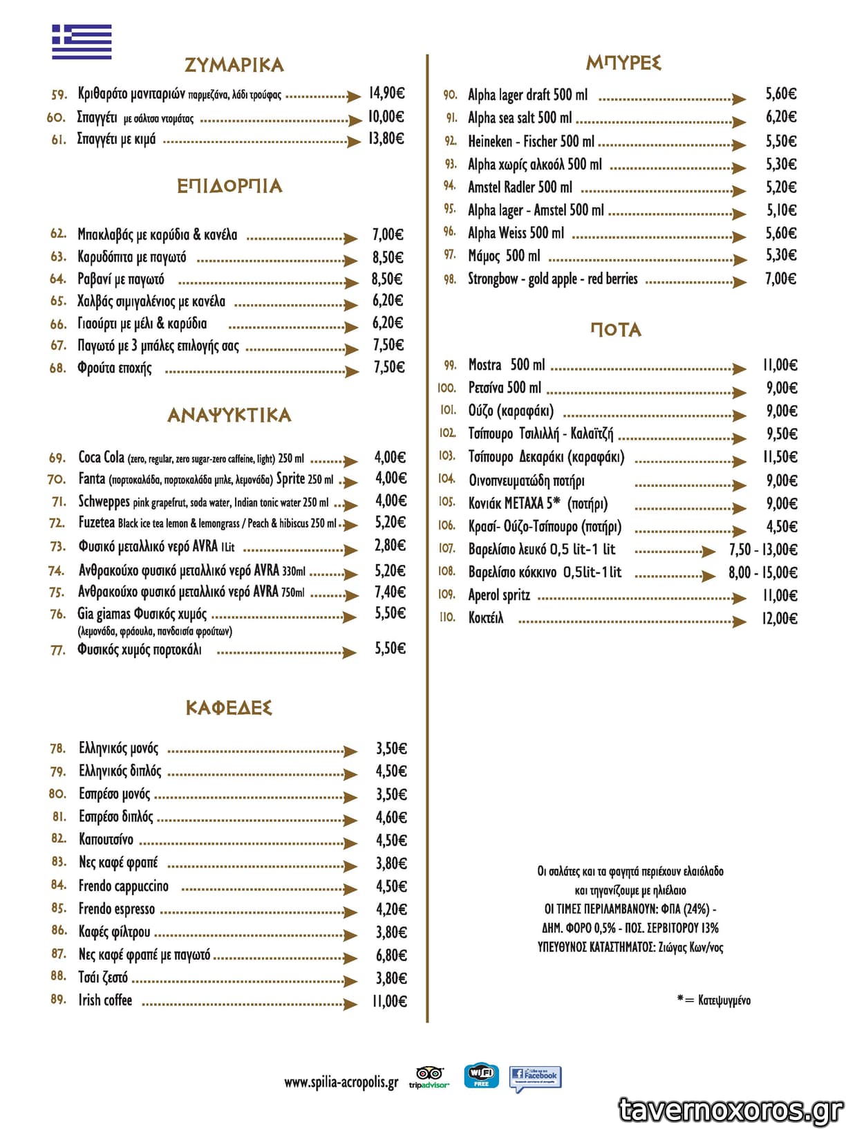 | Λέξεις κλειδιά | Cafe of Acropolis, #τουριστικό, #ποικιλία τυριών, #γαύρος μαρινάτος, #κολοκυθοκεφτέδες, #τυροπιτάκια, #μανιτάρια, #ντολμαδάκια αβγολέμονο, #γιαπράκια, #μπεκρή μεζές, #κεφτεδάκια, #λουκάνικο, #χαλούμι, #χοιρινή, #σκαλοπίνια, #μοσχαρίσια μπριζόλα, #μπιφτέκι, #κοτόπουλο, #σουβλάκι, #σουτζουκάκια, #μουσακάς, #γεμιστά, #γιουβέτσι, #σταμνάκι, #μοσχάρι νουά, #αρνάκι, #κλέφτικο, #χοιρινό ψητό, #σουτζουκάκια σμυρνέικα, #χταπόδι, #μύδια, #γαρίδες, #μπακαλιάρος σκορδαλιά, #χαλβάς, #ρεβανί, #μπακλαβάς |