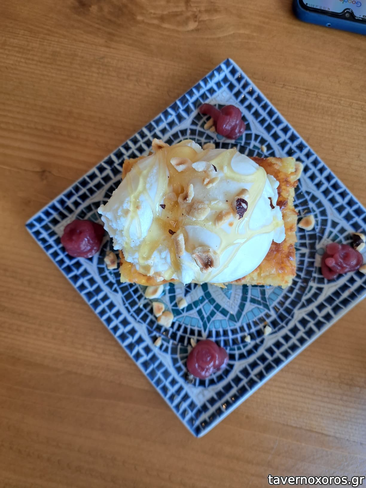 Πολύ μεγάλο κομμάτι καλής πορτοκαλόπιτας με παγωτό γιαούρτι, κρέμα ροδιού, θυμαρίσιο μέλι και φουντούκια στα 7 ευρώ.