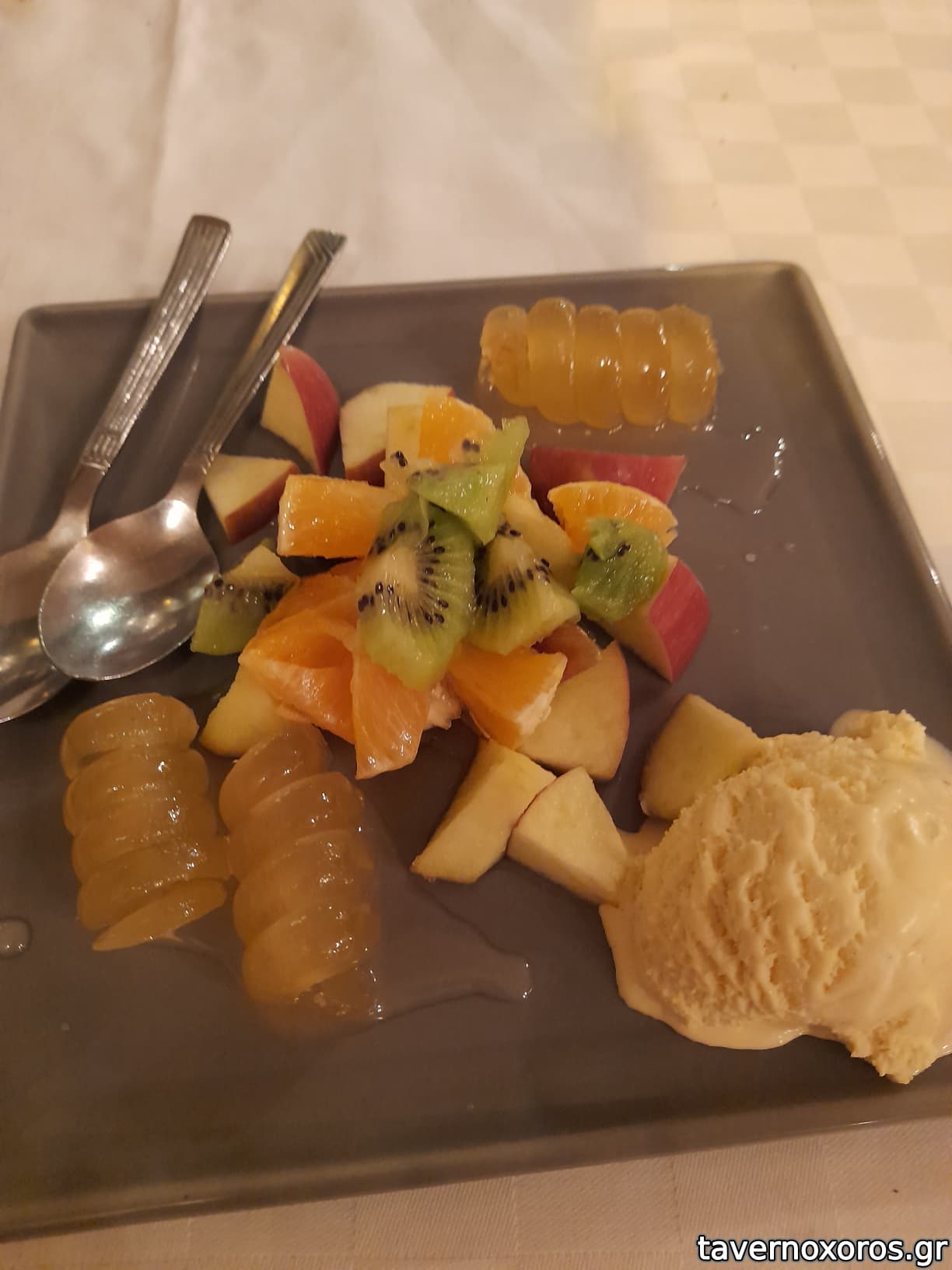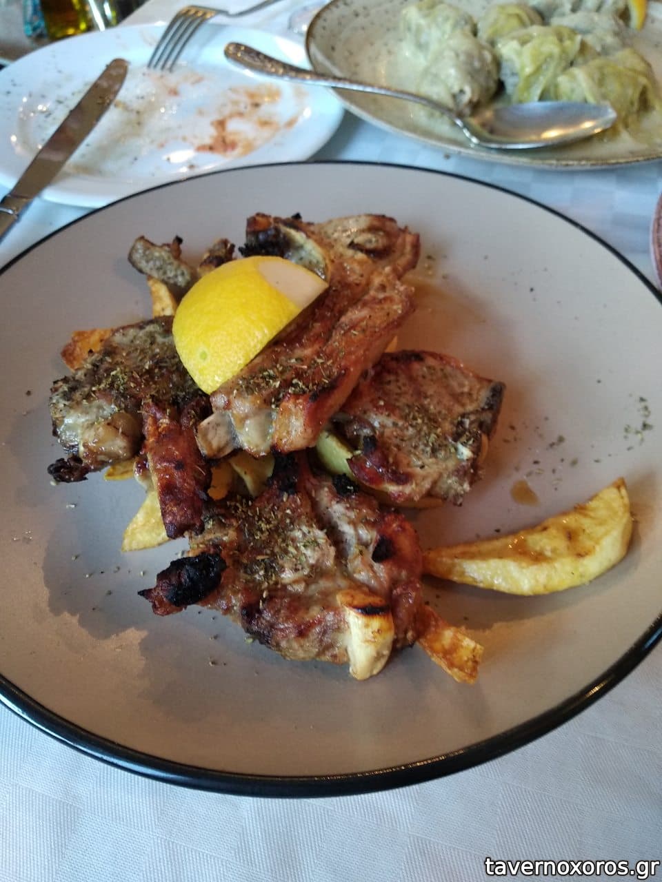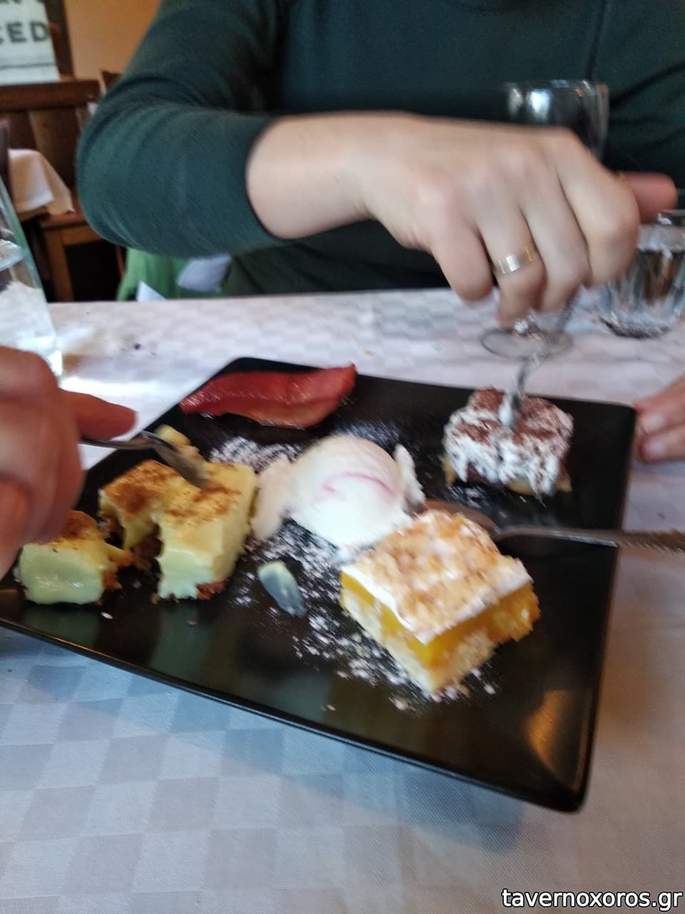 Γραπα στην αρχή με μια ποικιλία τυριών, η οποία ήταν άκυρη λόγω λάθους τρόπου κοψίματος των τυριών και στοίβας στον κορμό σερβιρισματος. Κοψίδια μαύρου χοίρου πολύ μαλακά και νόστιμα, μοσχαράκι λουκούμι με μελιτζάνα κολοκυθάκια πατάτα, πετυχημένα μανιτάρια με μυρωδικά και λευκό κρασί.