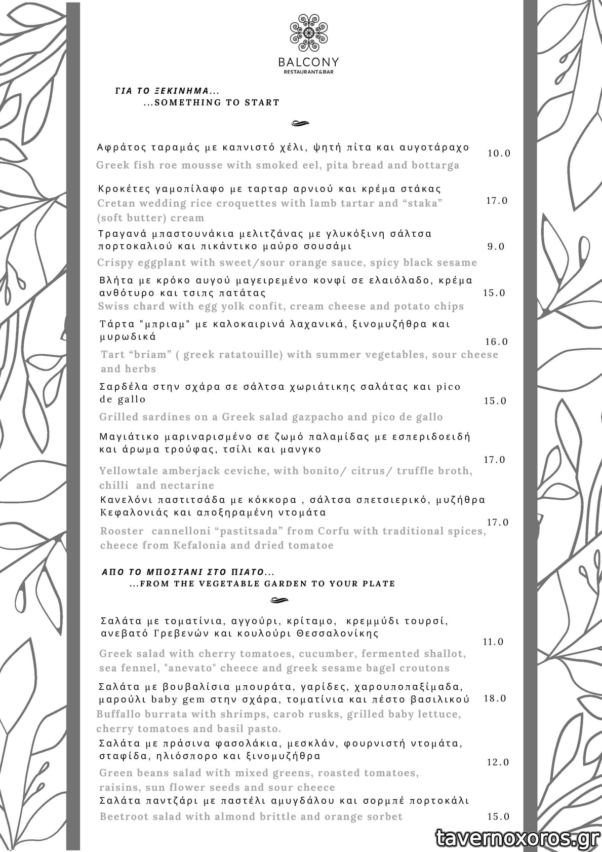 | Λέξεις κλειδιά | Μπαλκόνι, #ταράτσα, #θέα, #χέλι καπνιστό, #αυγοτάραχο, #γαμοπίλαφο, #σαρδέλα, #κόκορας παστιτσάδα, #χταπόδι, #οσομπούκο, #μανιτάρια, #κοτόπουλο, #steaks, #αρνάκι, #παϊδάκια, #γαλακτομπούρεκο |