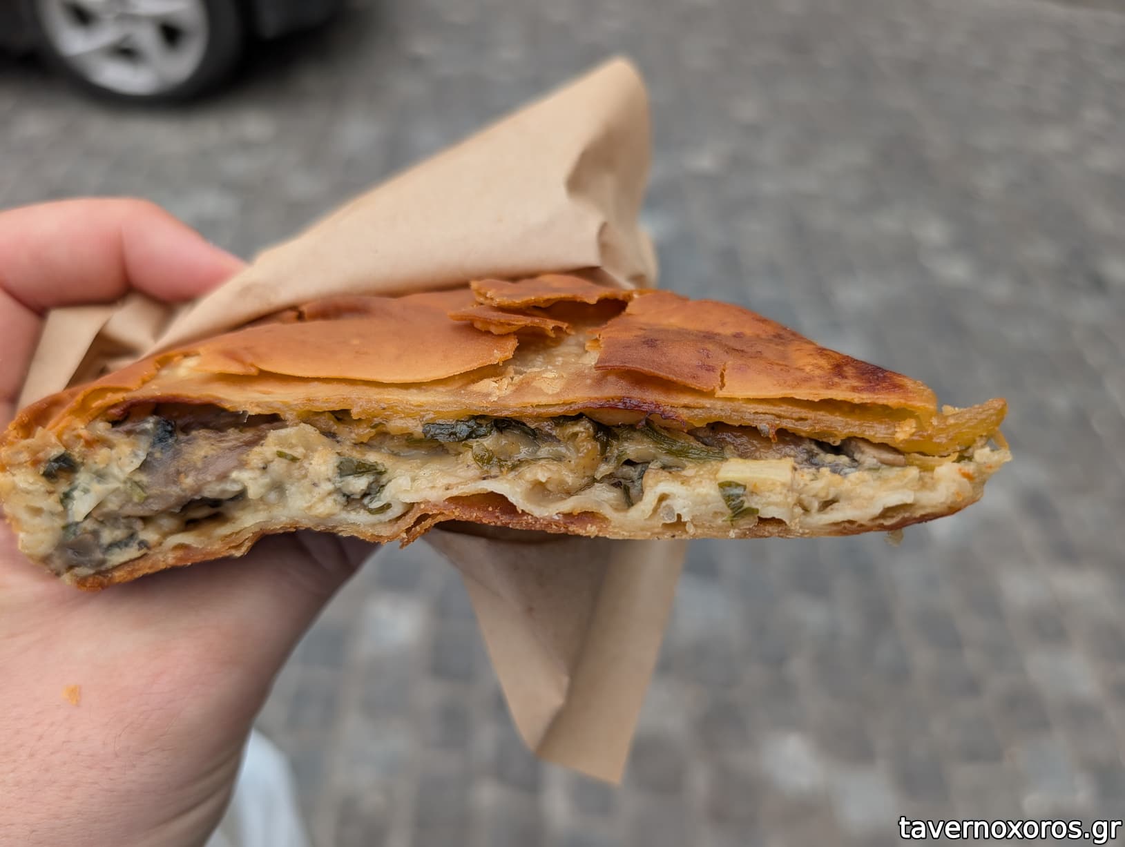 Δοκίμασα πρασσοτυροπιτα, η οποία είχε τραγανό φύλλο με αρκετούτσικο λαδακι και μπαμπατσικη γέμιση με μπόλικα μυρωδικά.
