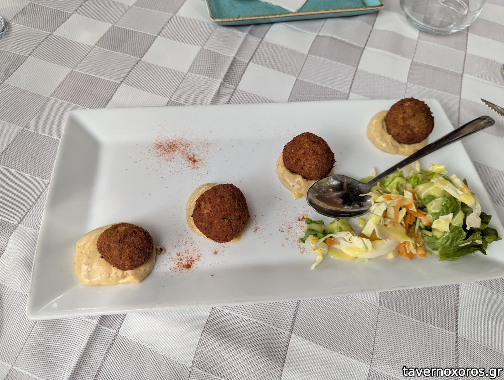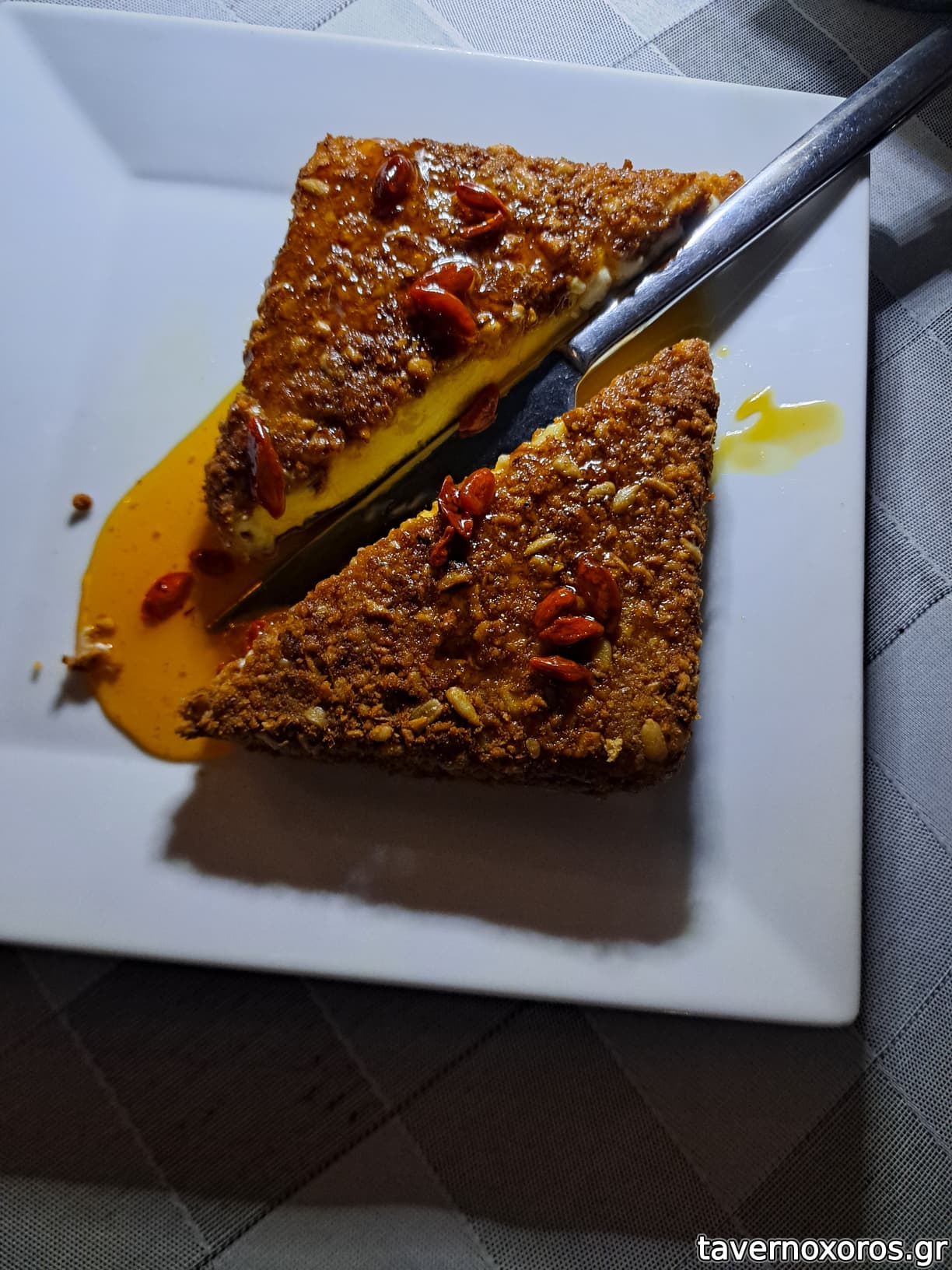 Φέτα παναρισμενη με καρύδι, κρόκο Κοζάνης, τριαντάφυλλο και φρούτα - πολύ καλό.