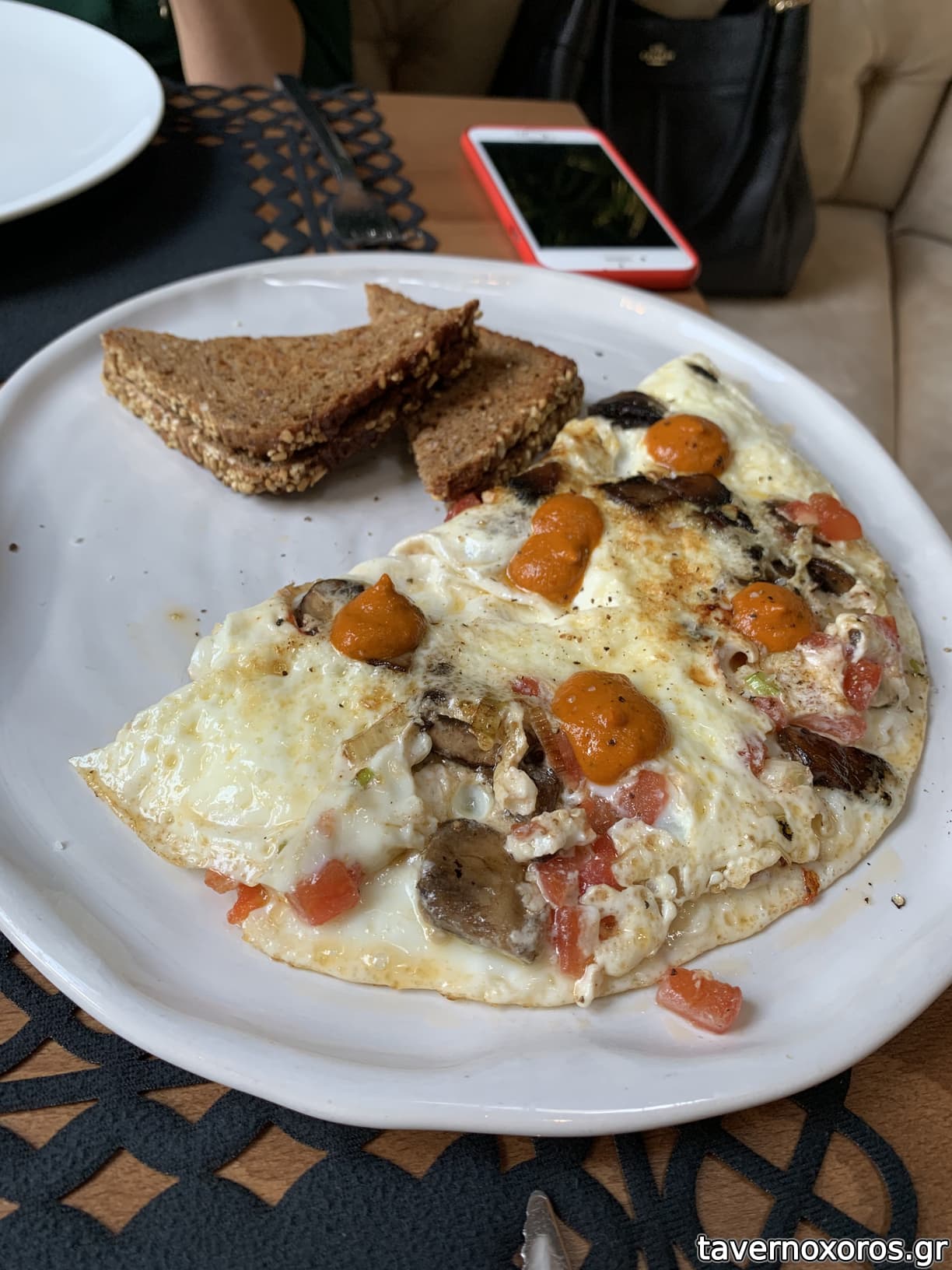 1 white omelette, πάρα πολύ καλή ομελέτα, ασπράδι με μανιτάρι και ντομάτα και φρέσκο κρεμμυδάκι