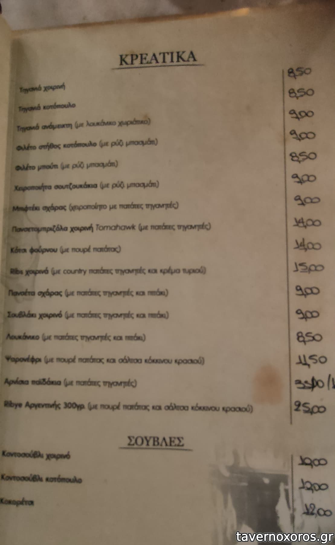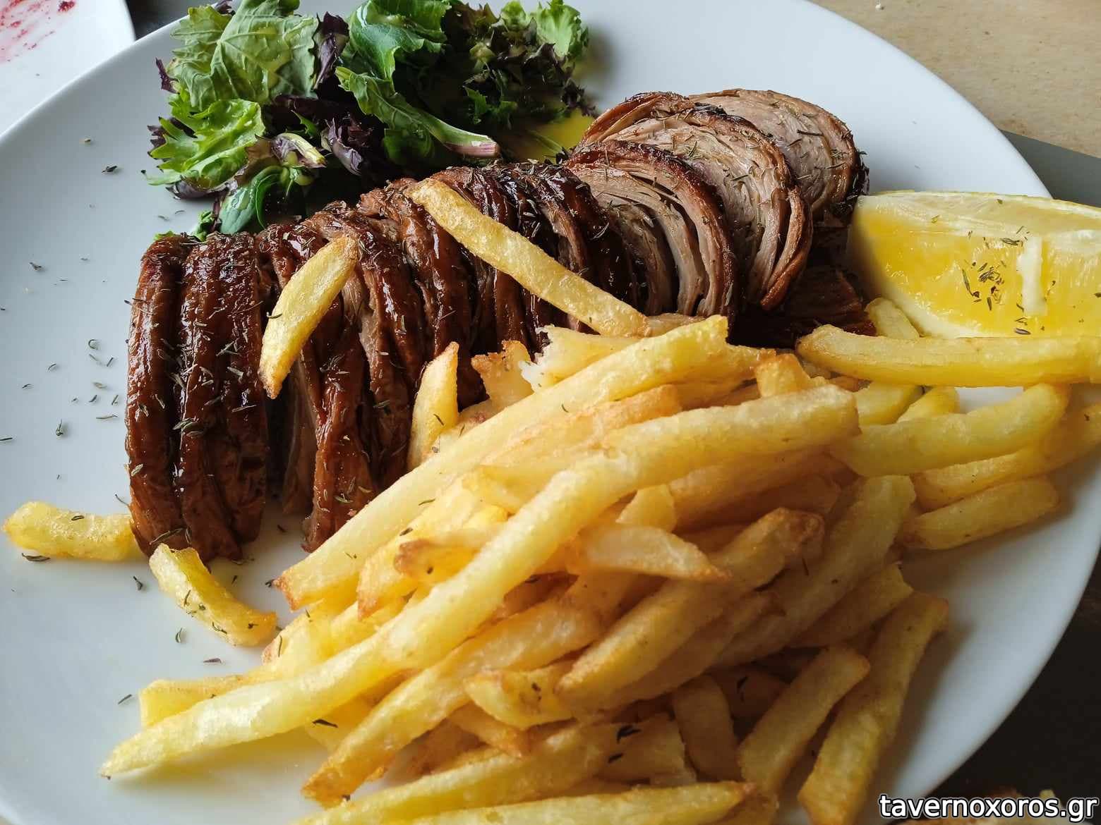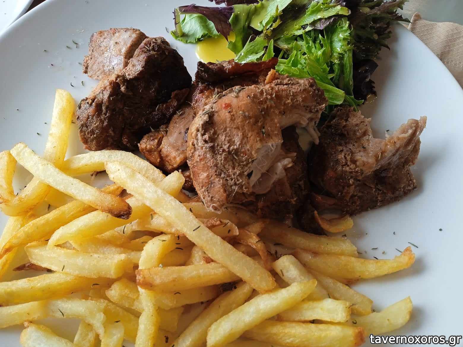 Έχει μια εσωτερική αίθουσα με μεγάλες τζαμαρίες και επίσης στην απέναντι πλευρά του δρόμου υπάρχει και μια μεγάλη ξύλινη βεράντα με τέντες κι άλλα τόσα τραπέζια. Απρίλιος 2023, παρέα 4 ατόμων, πήραμε σαλάτα σπανάκι, γλυστρίδα, λόλα, μυζήθρα, ντοματίνια κλπ. (7,00 €), ταλαγάνι ψητό (5,50 €), πατάτες τηγανητές φρέσκιες (4,20 €), τζιγεροσαρμά (10,00 €), στήθος γαλοπούλας με κάρυ (8,00 €), «κοντοσούβλι» χοιρινό (15,00 €), κοκορέτσι (12,00 €), ½ λίτρο χύμα κρασί (7,50 €), νερό 1½ λίτρο (1,50 €) και ψωμί για 4 άτομα (2,00 € το άτομο Χ 4 = 8,00 €!). Στο τέλος κερασμένο ρεβανί. Όλα καλά, σέρβις φιλικό, μερίδες μεγάλες, τεράστιες ποσότητες τηγανητές πατάτες παντού (βλ. φωτο). Μουσική ζωντανή δεν είχε. Είχε όμως από τα ηχεία σε χαμηλή ένταση. Τα 8,00 για το ψωμί τα θεωρώ υπερβολικά πολλά. Μεγάλο σφάλμα το ότι δεν αναφέρεται στον κατάλογο το ψωμί. Σύνολο 78,70 €, ήτοι με τα ρέστα 1,30 € για πουρμπουάρ βγήκε 20,00 το άτομο. Δεν περάσαμε άσχημα, αλλά δεν μπορώ να πω ότι μείναμε κι ευχαριστημένοι. Δεν πρόκειται να ξαναπάω.