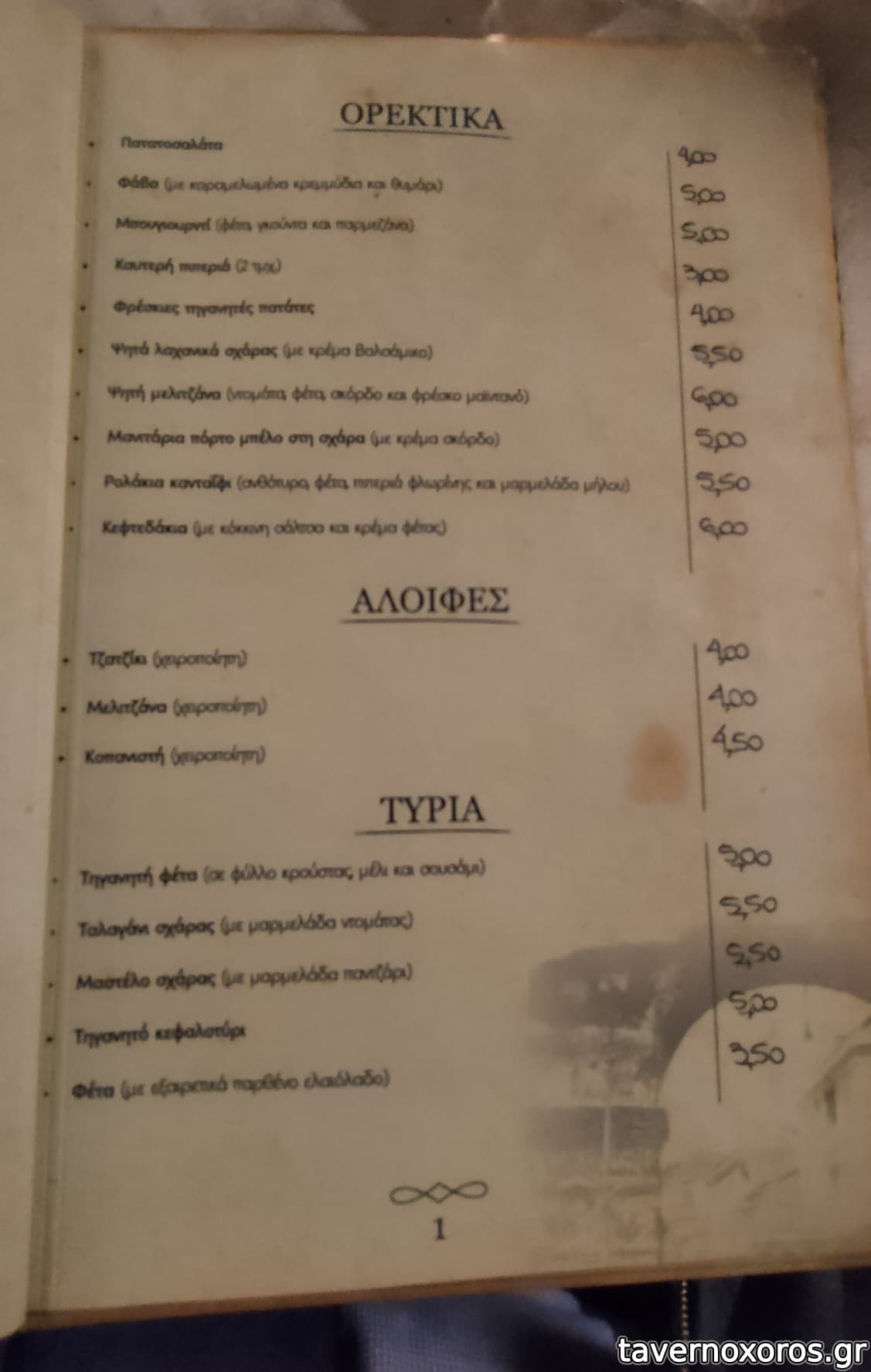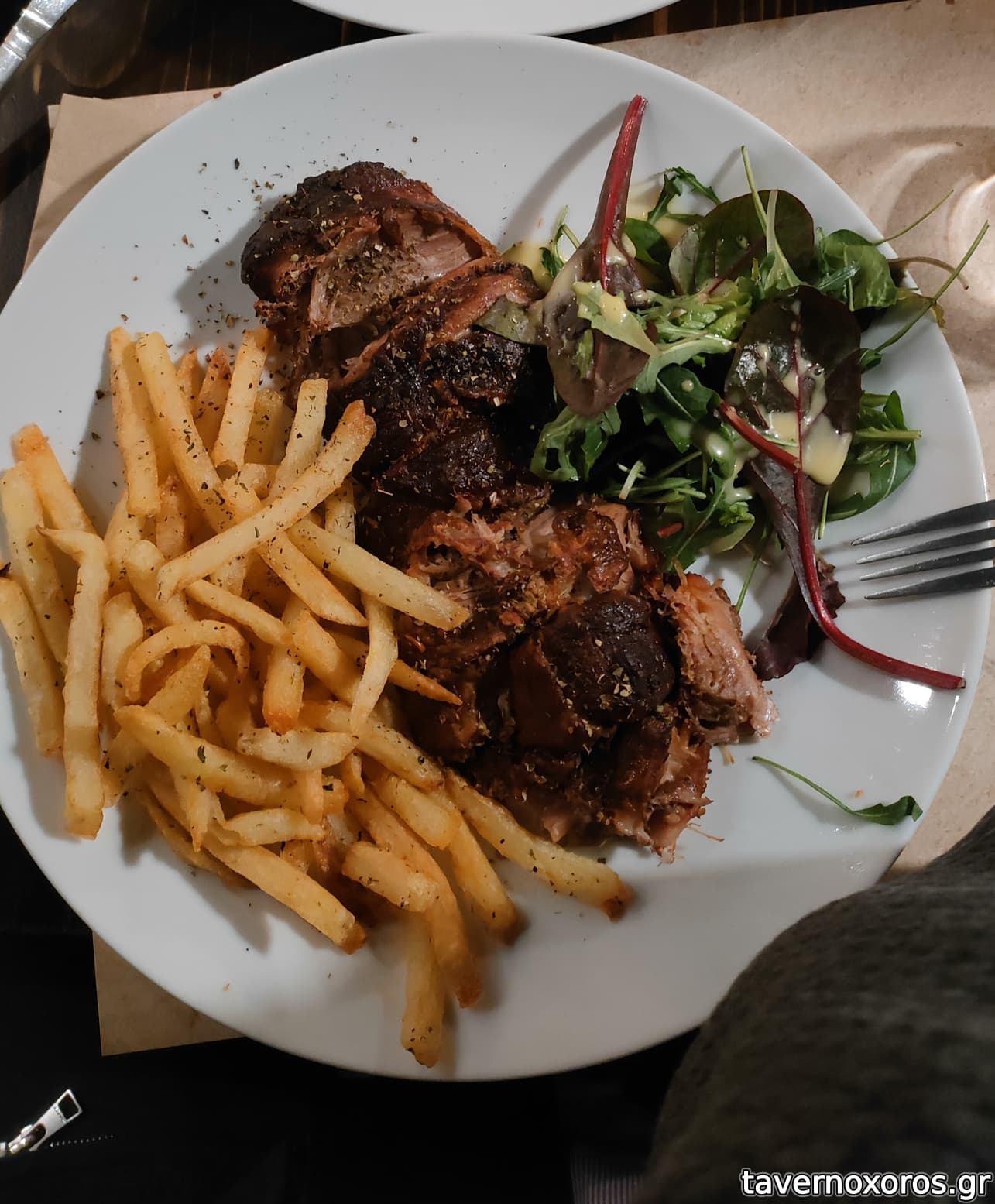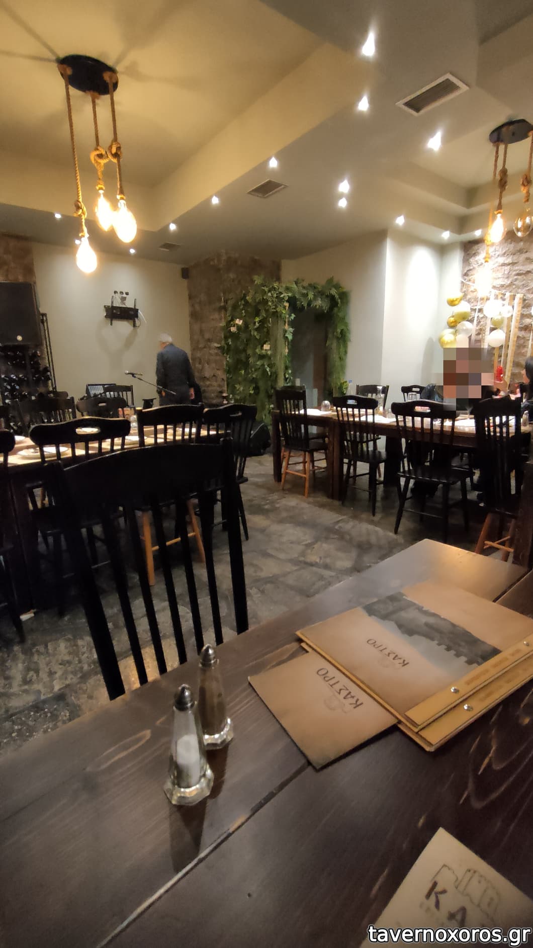 Έχει μια εσωτερική αίθουσα με μεγάλες τζαμαρίες και επίσης στην απέναντι πλευρά του δρόμου υπάρχει και μια μεγάλη ξύλινη βεράντα με τέντες κι άλλα τόσα τραπέζια. Απρίλιος 2023, παρέα 4 ατόμων, πήραμε σαλάτα σπανάκι, γλυστρίδα, λόλα, μυζήθρα, ντοματίνια κλπ. (7,00 €), ταλαγάνι ψητό (5,50 €), πατάτες τηγανητές φρέσκιες (4,20 €), τζιγεροσαρμά (10,00 €), στήθος γαλοπούλας με κάρυ (8,00 €), «κοντοσούβλι» χοιρινό (15,00 €), κοκορέτσι (12,00 €), ½ λίτρο χύμα κρασί (7,50 €), νερό 1½ λίτρο (1,50 €) και ψωμί για 4 άτομα (2,00 € το άτομο Χ 4 = 8,00 €!). Στο τέλος κερασμένο ρεβανί. Όλα καλά, σέρβις φιλικό, μερίδες μεγάλες, τεράστιες ποσότητες τηγανητές πατάτες παντού (βλ. φωτο). Μουσική ζωντανή δεν είχε. Είχε όμως από τα ηχεία σε χαμηλή ένταση. Τα 8,00 για το ψωμί τα θεωρώ υπερβολικά πολλά. Μεγάλο σφάλμα το ότι δεν αναφέρεται στον κατάλογο το ψωμί. Σύνολο 78,70 €, ήτοι με τα ρέστα 1,30 € για πουρμπουάρ βγήκε 20,00 το άτομο. Δεν περάσαμε άσχημα, αλλά δεν μπορώ να πω ότι μείναμε κι ευχαριστημένοι. Δεν πρόκειται να ξαναπάω.