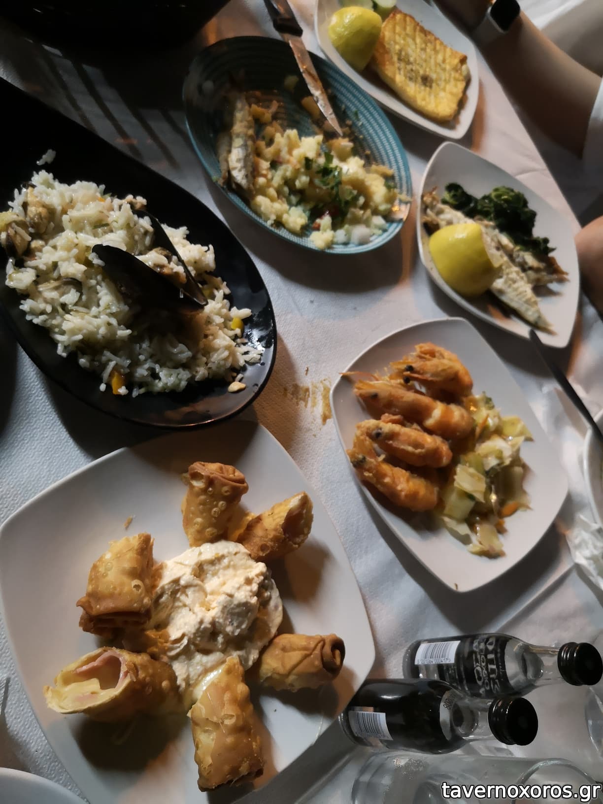 2η γύρα - μυδοπίλαφο, γαρίδες με λάχανο τουρσί, κεφαλοτύρι σαγανάκι, ψάρι με χόρτα και μπουρεκάκια με ζαμπόν τυρί και κοπανιστή (μέτρια όλα, το ψάρι ξεχώρισε κάπως)