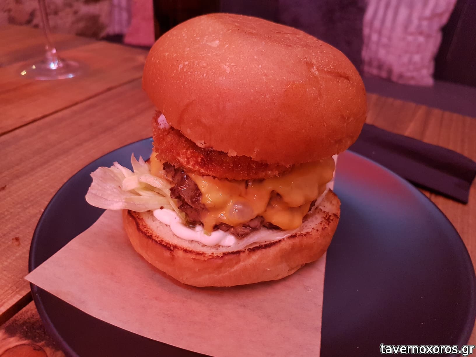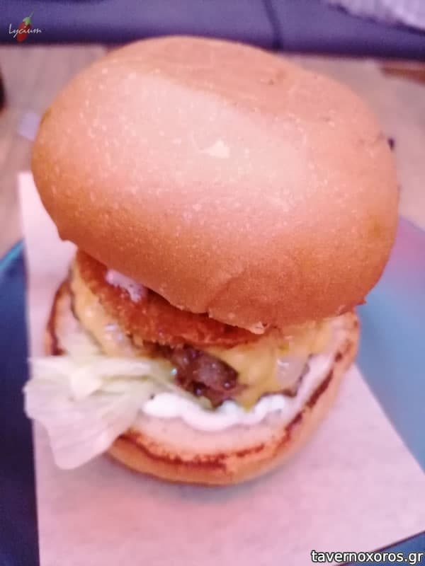 "Chevre Cheeseburger / κατσικίσιο / διπλό Black Angus μπιφτέκι / truffle μαγιονέζα / καραμελωμένα κρεμμύδια" (καλό, αλλά υπερβολικά ακριβό στα 9,9€)