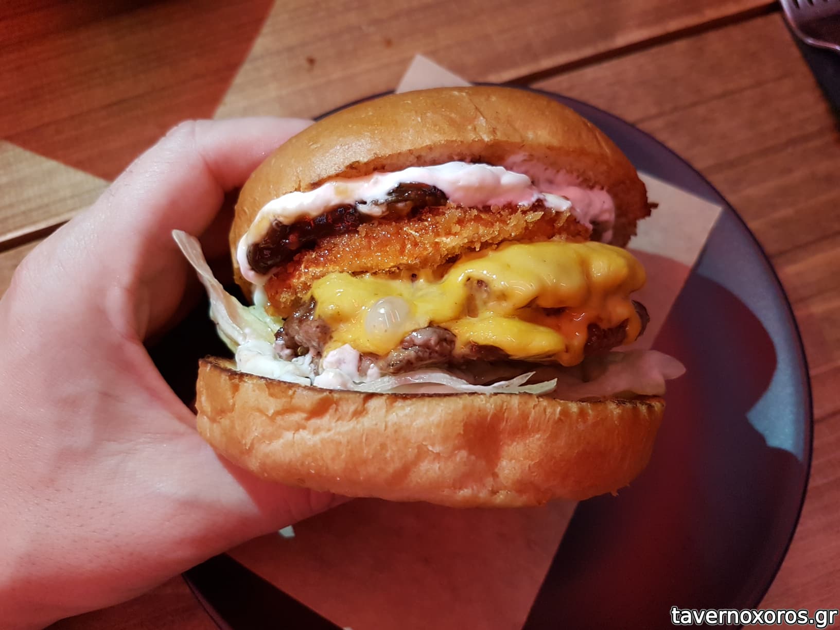 "Smokey burger / pulled pork / διπλό Black Angus μπιφτέκι / cheddar / iceberg / smokey mayo / πίκλες"