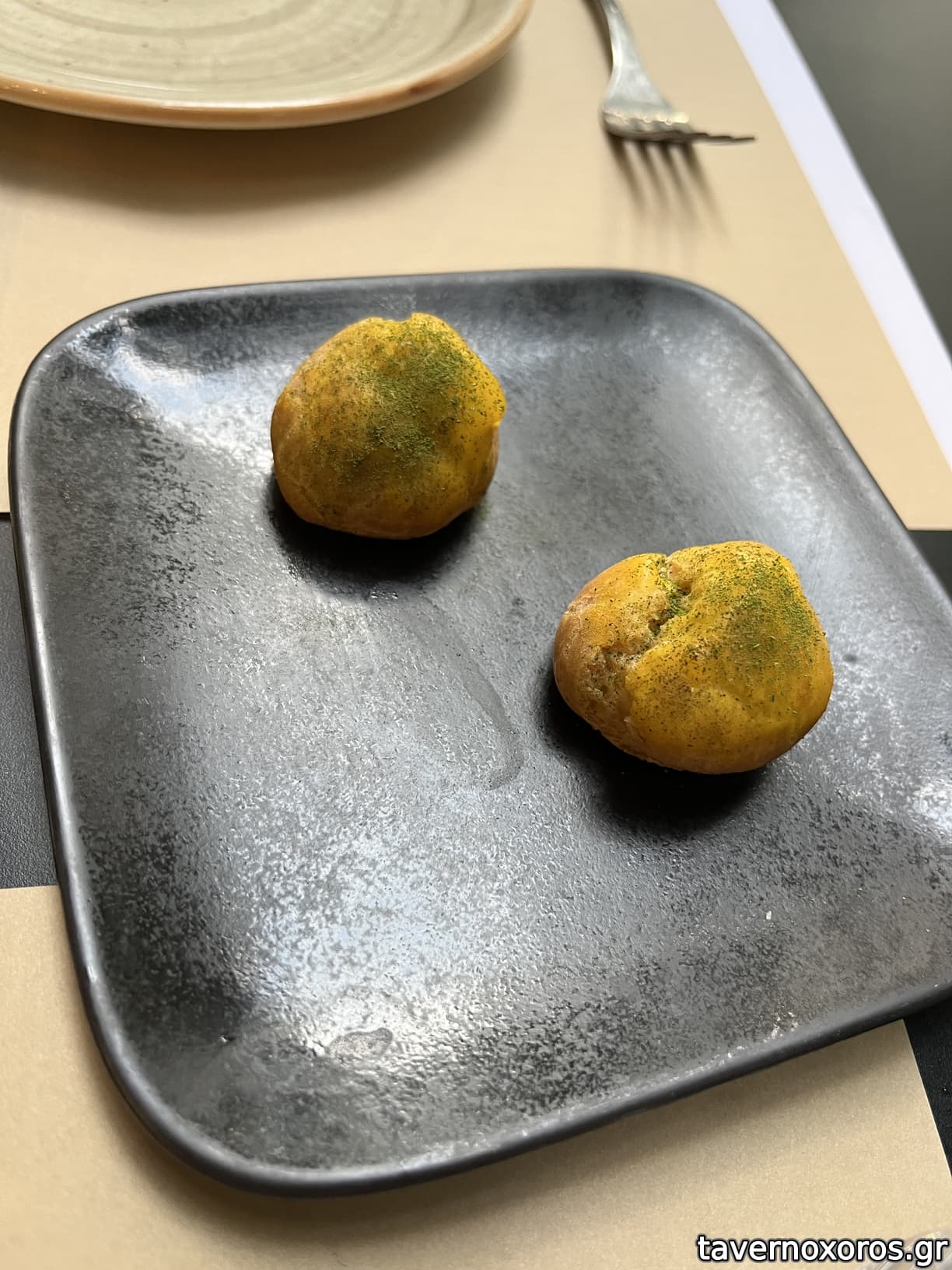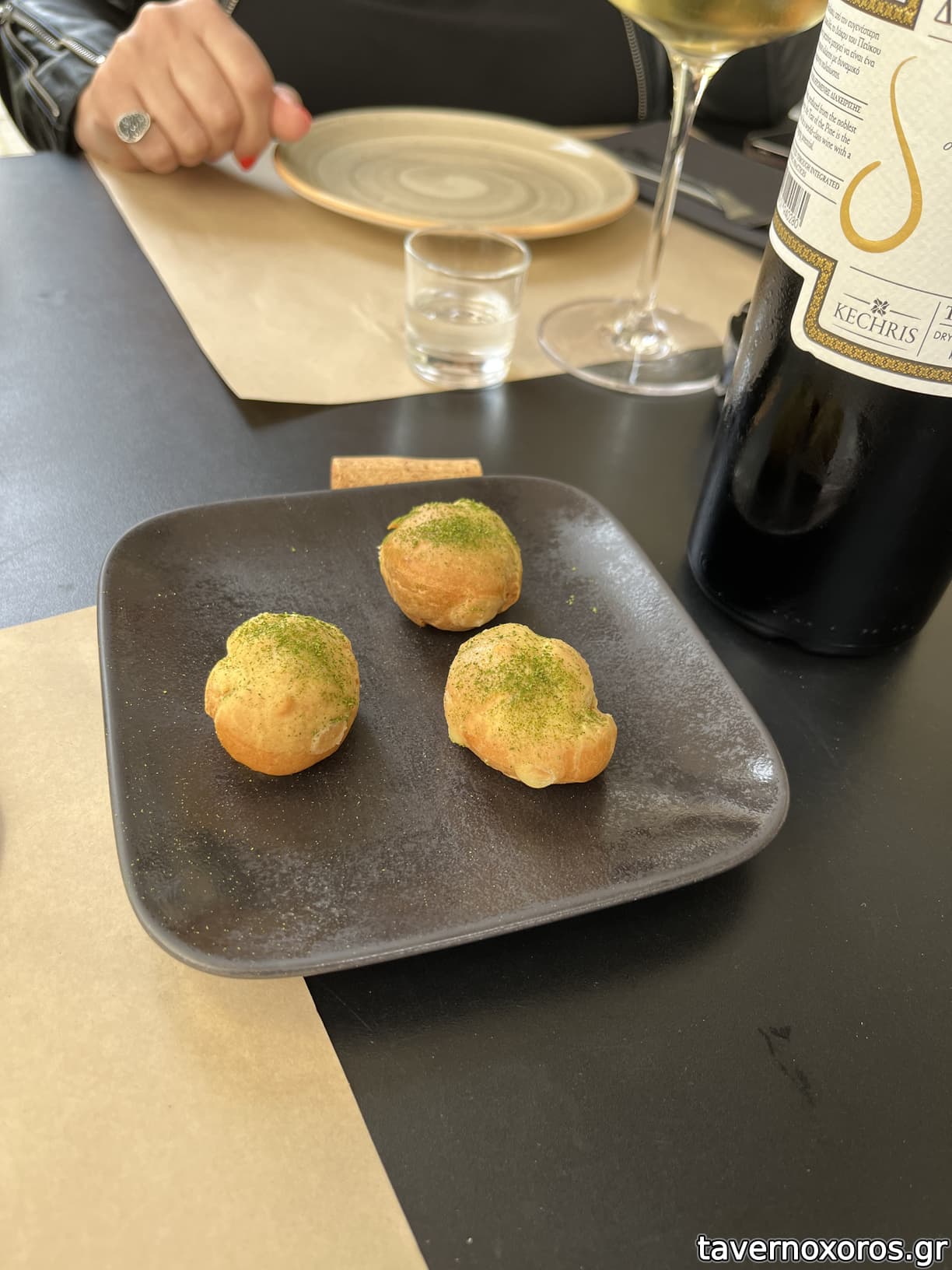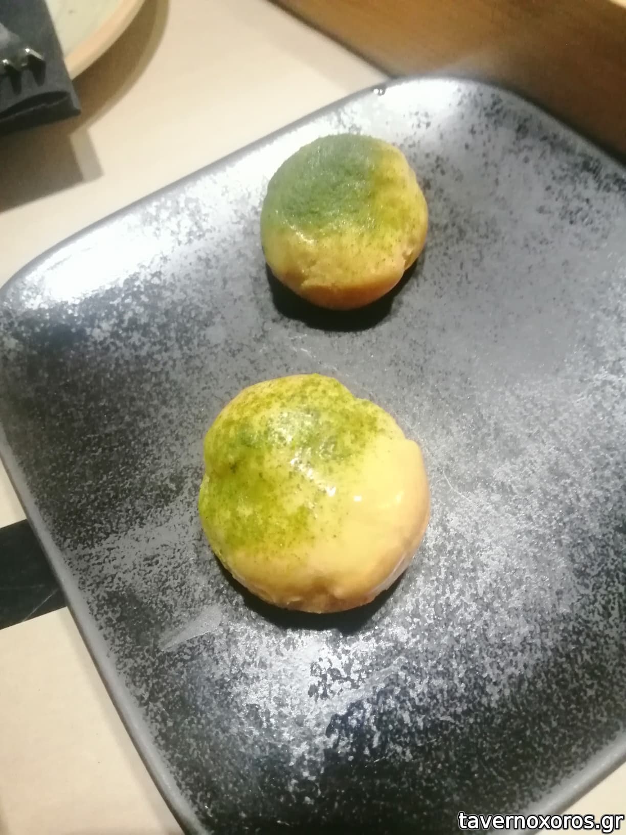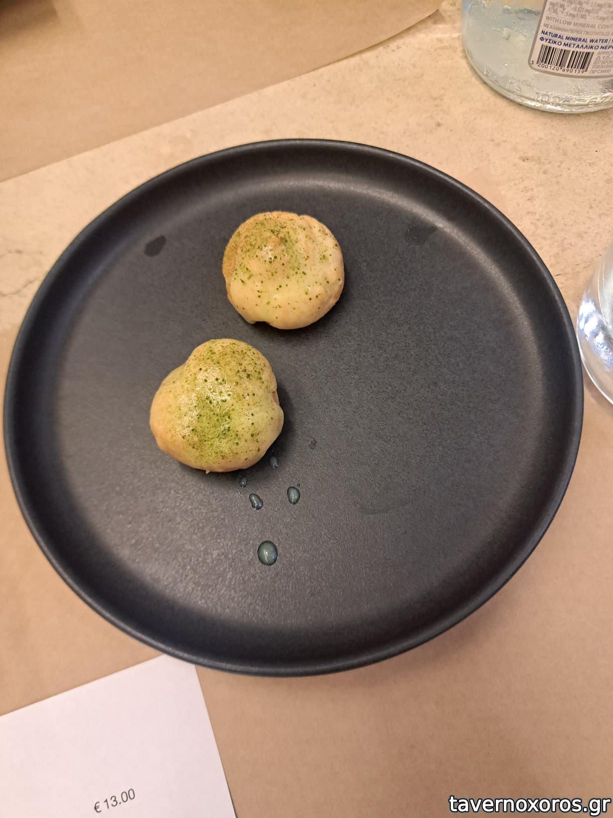 Καλωσόρισμα choux με ταραμά , αμύγδαλο και wasabi . Προσωπικά μου άρεσε αλλά για κάποιον που δεν αντέχει τα καυτερά , καλύτερα να το αποφύγει .