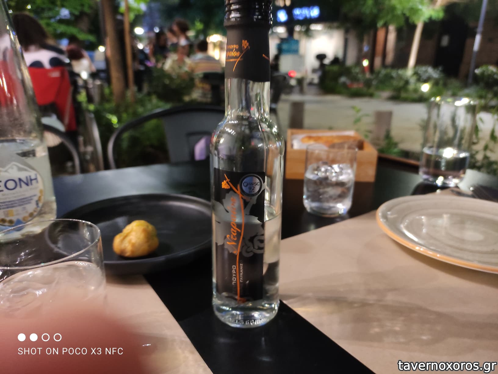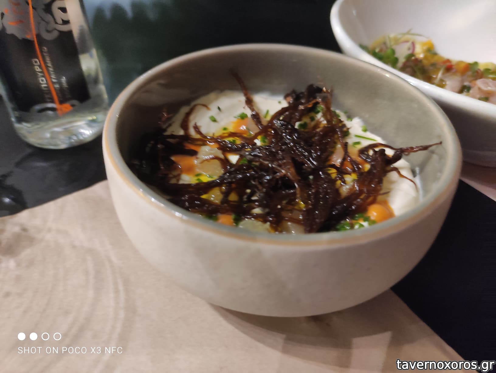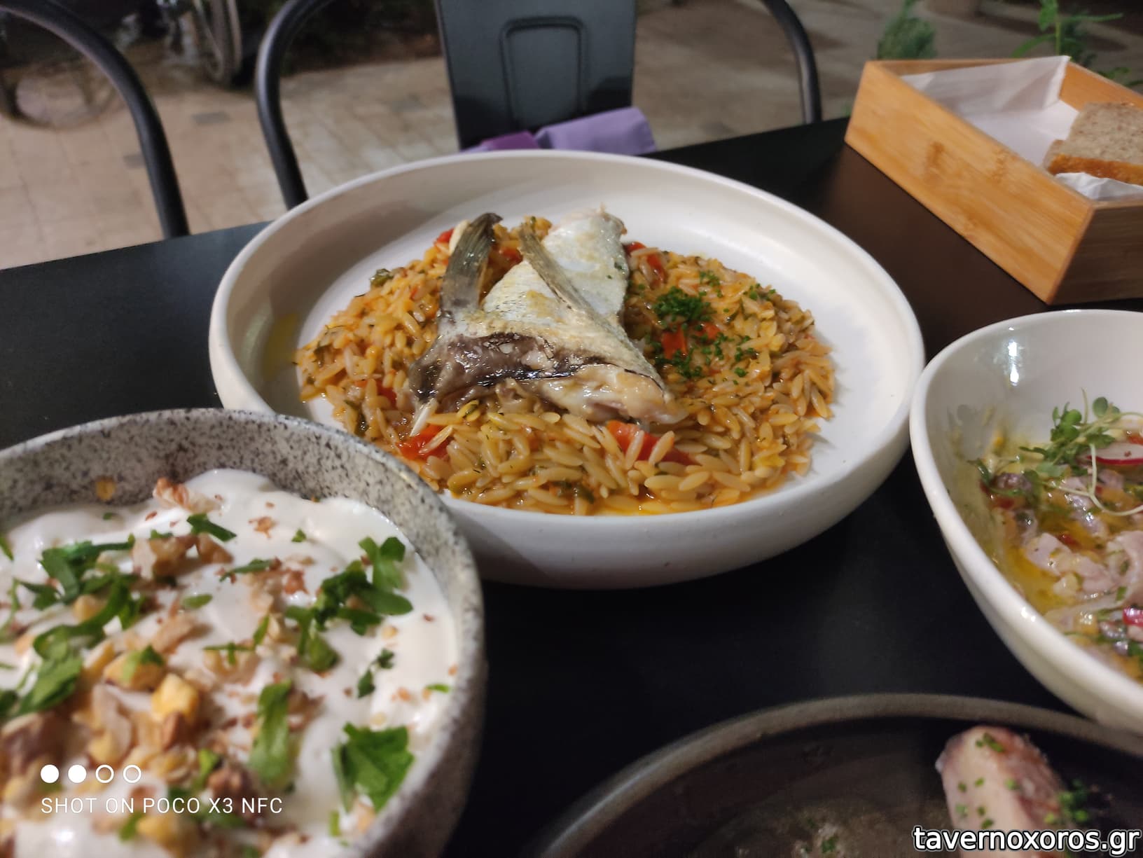 Μας υποδέχτηκαν με κερασμένη ρακί και κάτι σαν σφαίρες με γέμιση ταραμά με αβοκάντο. Πολύ νόστιμο. Παραγγείλαμε πράσινο ντάκο - πάρα πολύ καλός, γαρίδες σωτέ (2 φορές) – πάρα πολύ νόστιμες με τέλειο μαγείρεμα και στα λαχανικά. Φασολάκια σχάρας – πραγματικά υπέροχη γεύση. Πρώτη φορά έτρωγα φασολάκια μαγειρεμένα έτσι και σίγουρα θα το ξανακάνω. Πατάτες τηγανητές, οι οποίες είχαν την οικειότητα πατάτας από junkfoodαδικο (για καλό το λέω), αλλά περιποίηση εστιατορικής κουζίνας. Το τσιγαριαστό αρνάκι με κρέμα τραχανά και πρόβειο γιαούρτι ήταν κι αυτό πολύ νόστιμο, ίσως το αρνί να ήθελε λιγότερο μαγείρεμα (για τα γούστα μου). Από τα ραβιόλια γαρίδας, παρόλη την πολύ ωραία εμφανιση και τα πολύ ωραία ραβιόλια, μου έλειψε η ένταση στη γεύση και ήταν μάλλον το πιο αδιάφορο πιάτο. Η σαλάτα μαύρης φακής κι αυτή πάρα πολύ καλή, δροσερή και πρωτότυπη, με πολύ ωραίο δέσιμο στα υλικά. Το συκώτι δεν με εντυπωσίασε αλλά φαγώθηκε σίγουρα χωρίς δυσαρέσκεια.