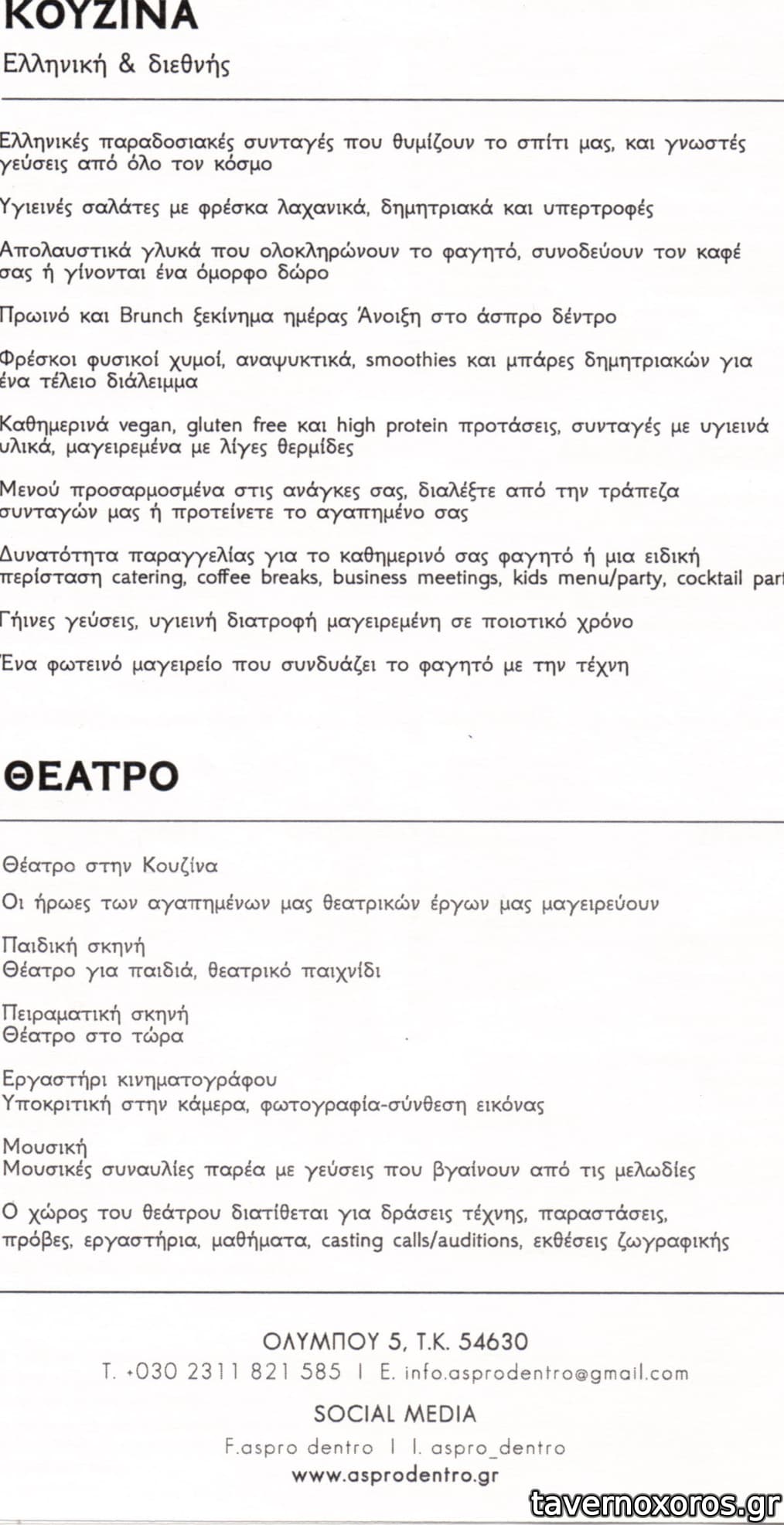 | Λέξεις κλειδιά | #cafe, #θέατρο, #μωσαϊκό, #πρωινό, #brunch, #snacks, #vegan-friendly, #αυγά, #ομελέτα, #αυγόφετες, #τοστ, #bagels, #χυμοί, #κρέπες, #σαλάτες, #τραχανάς, #βραστό, #κοτόσουπα, #ψαρόσουπα, #μπορς, #κρεμμυδόσουπα, #χαλβάς, #προφιτερόλ, #ρεβανί, #μπακλαβάς, #cheesecake, #γεμιστά, #φασολάκια, #μπάμιες, #μακαρόνια, #πιλάφι, #στριφτάρια, #μουσακάς, #κεφτεδάκια, #τηγανιά, #κοτόπουλο, #κοκκινιστό, #γαρίδες, #ψάρια |