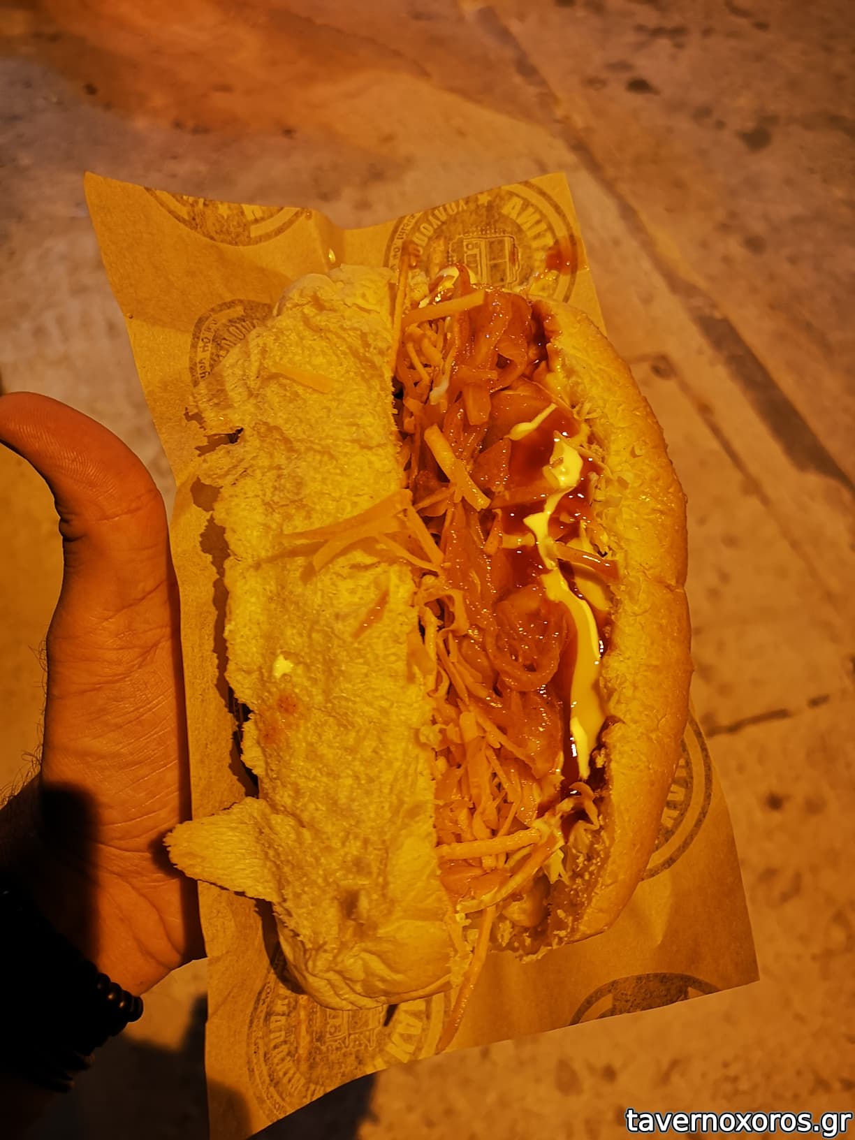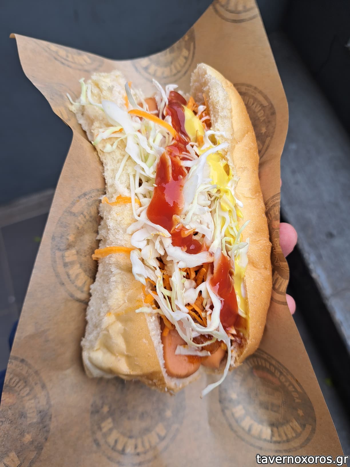 Δύο λουκάνικα μέσα στο ψωμάκι και από κει και πέρα λίγο καραμελωμένο κρεμμύδι και τεράστια ποσότητα από λάχανο-καρότο και κέτσαπ-μουστάρδα.