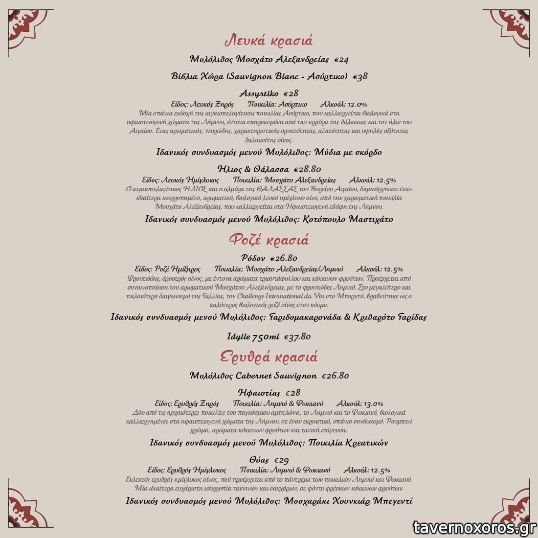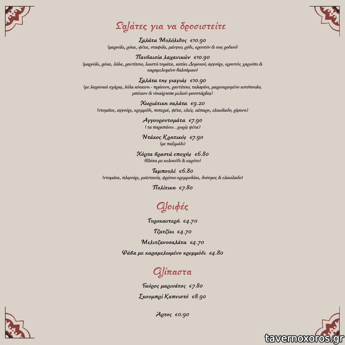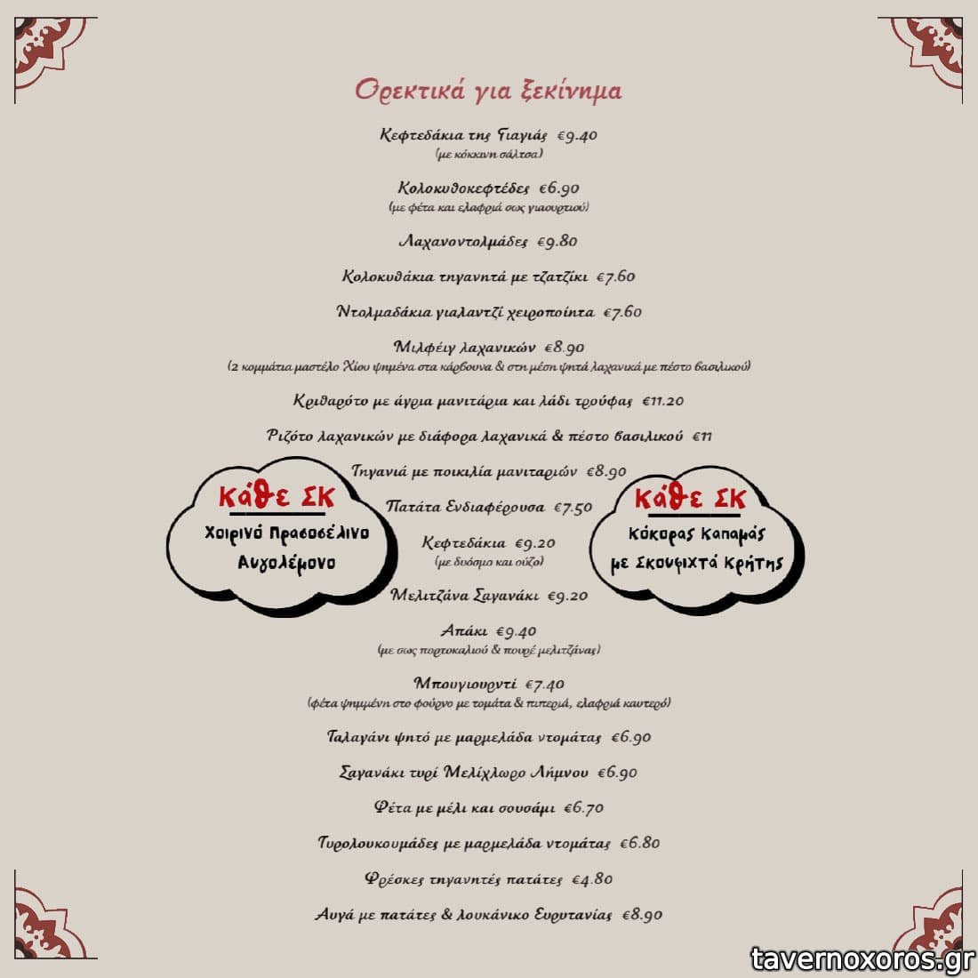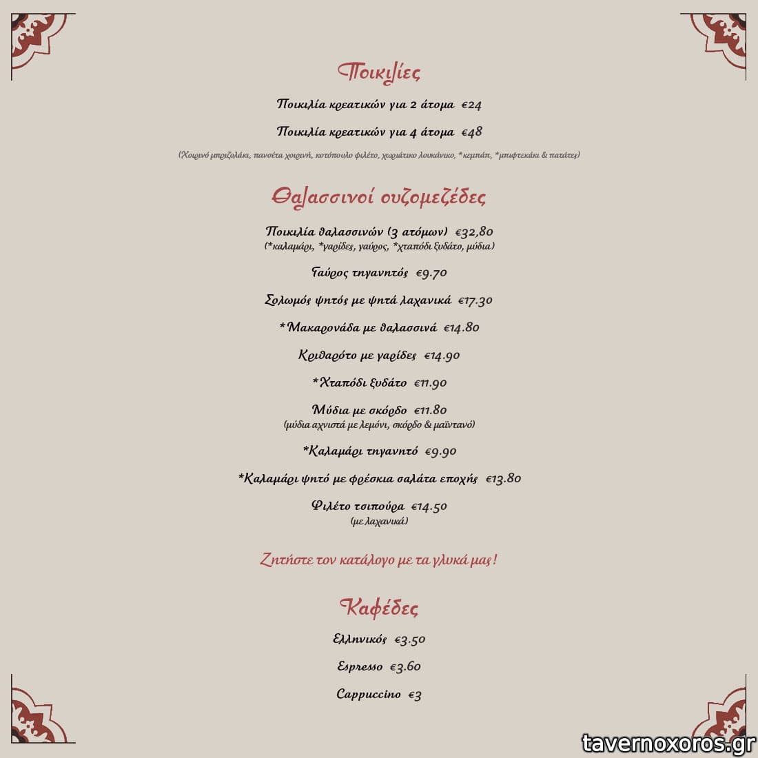 | Λέξεις κλειδιά | #ταράτσα, #τζάκι, #γαύρος μαρινάτος, #κεφτεδάκια, #ντάκος, #κολοκυθοκεφτέδες, #χοιρινή, #ταμπουλέ, #φάβα, #κολοκυθάκια, #λαχανοντολμάδες, #μανιτάρια, #ντολμαδάκια, #αυγά, #λουκάνικο, #μελίχλωρο, #χοιρινό πρασοσέλινο, #κόκορας, #καπαμάς, #σκιουφιχτά, #κοντοσούβλι, #ουρά μοσχαρισία, #ψαρονέφρι, #κατσίκι λεμονάτο, #τηγανιά, #σπεντζοφάι, #μπεκρή μεζές, #σουτζουκάκια, #μάγουλα, #συκώτι, #κοτόπουλο, #χουνκιάρ μπεγεντί, #μπιφτεκάκια, #πανσέτα, #μοσχαρίσια μπριζόλα, #ζυμαρικά, #σολομός, #γαύρος, #χταπόδι, #μύδια |