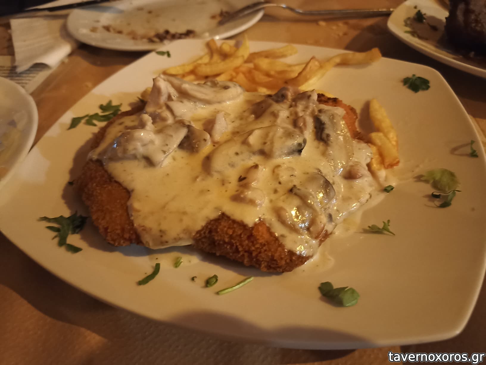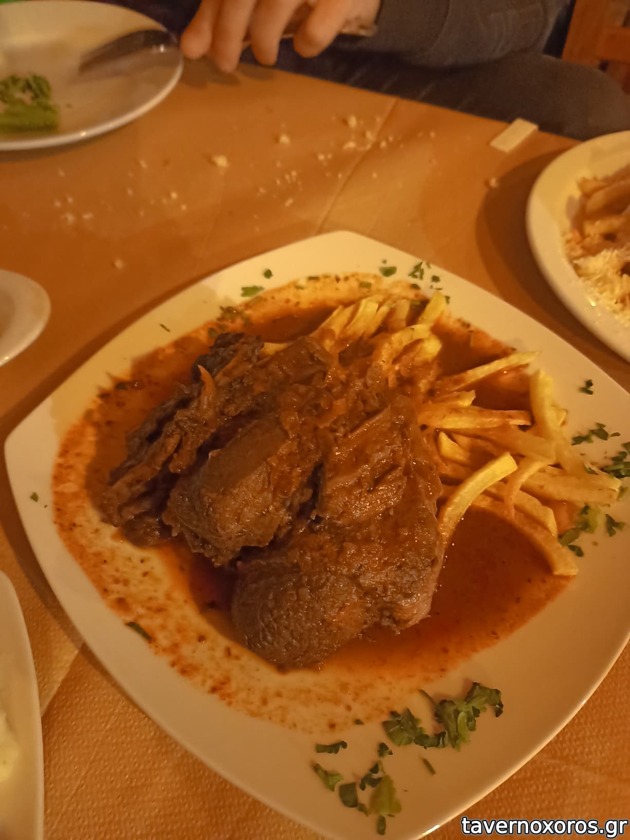 Μαγειρευτό: Αγριογούρουνο κοκκινιστό στη γάστρα με πατάτες τηγανιτες. Αρκετά νόστιμη κρασάτη η σάλτσα και το κρέας σχετικά τρυφερό.